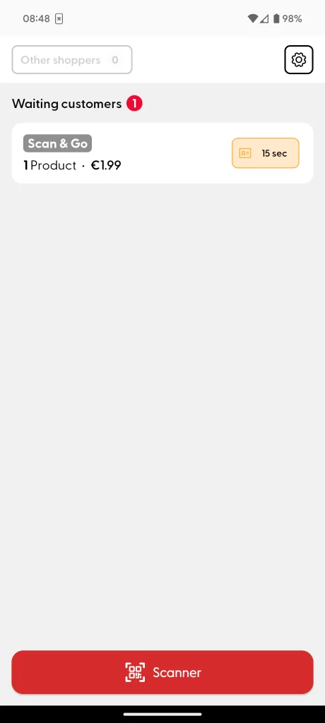 As an employee, when a customer is waiting to be age-verified, you will see the customer basket in the “Waiting customers” section. The waiting time is displayed next to the customer card.