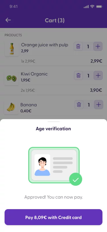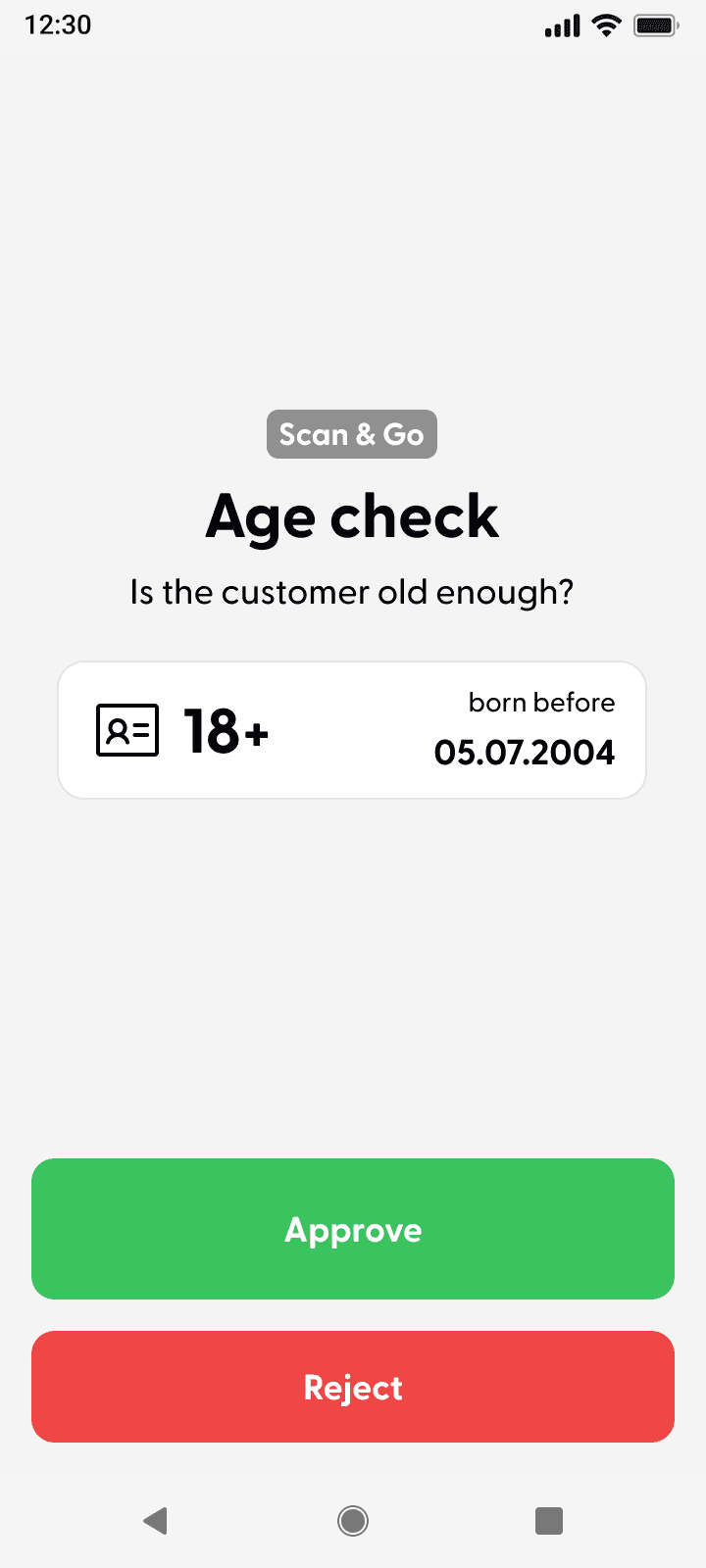 If a shopper is allowed to buy the products, tap the “Approve” button and the shopper will be able to continue with their payment (Picture (3)). Otherwise, you can hold on the big “Reject” button and the shopper will need to remove the restricted product from their shopping cart to continue. Do not worry if you accidentally reject the purchase: the shopper can retry the payment process and the Age Verification will open again if it has not been approved.