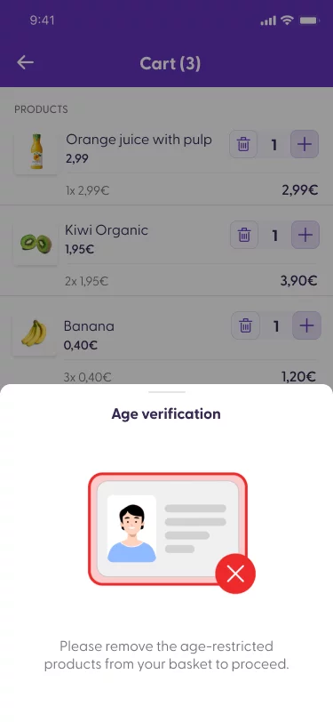 After scanning the code, you will see the minimum date of birth that the shopper should have on their ID card to be able to purchase the restricted item in their shopping cart (Picture (2)). The age displayed here is provided in the product information. For example, shoppers in Germany can buy beer from age 16 but spirits (stronger alcoholic drinks) from age 18. Other products can also contain restrictions, and this is handled by our Scan & Go system to help employees verify customers quickly and efficiently.