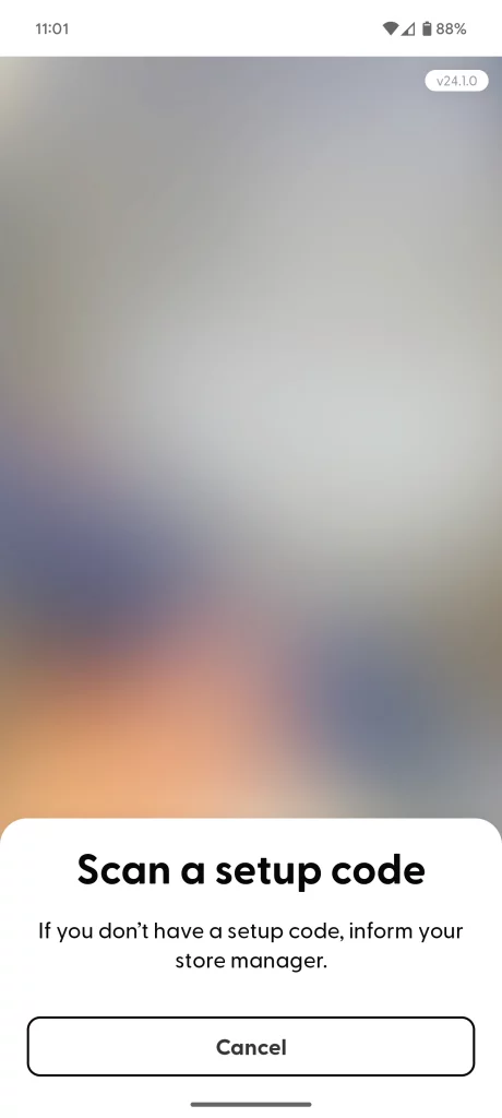 Tap on “Scan a setup code” to open the scanner and scan the code provided by your shopreme integration consultant. This code contains information about the organization and a URL to connect to (the shopreme middleware server URL).