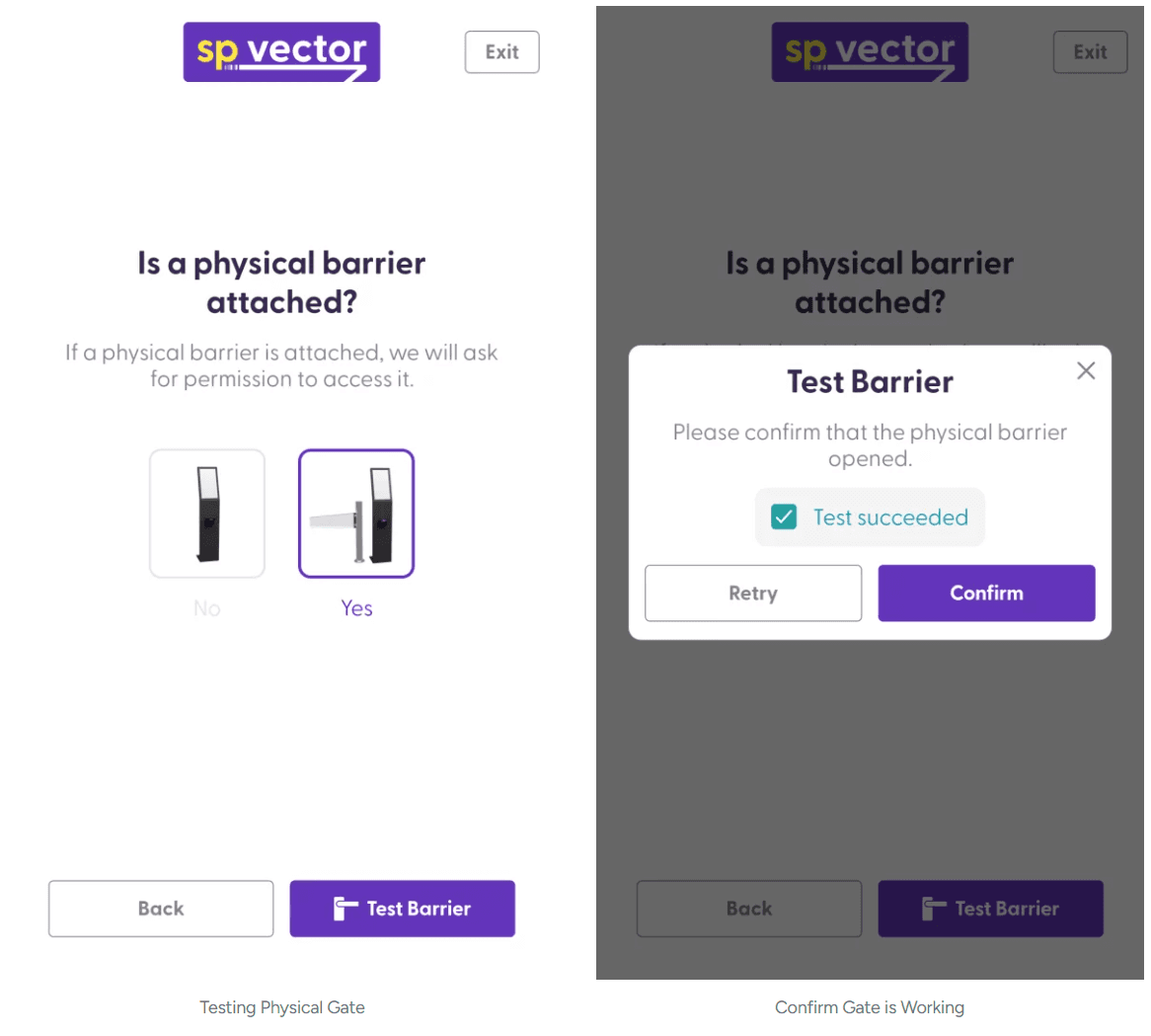 Next, the app will help you test the functionality of your exit gate. If an exit gate is connected to the vector, choose “Yes” and click on “Continue”. Please check if the gate opens and confirm manually. If no gate is connected, please select “No” and click on “Continue”.
