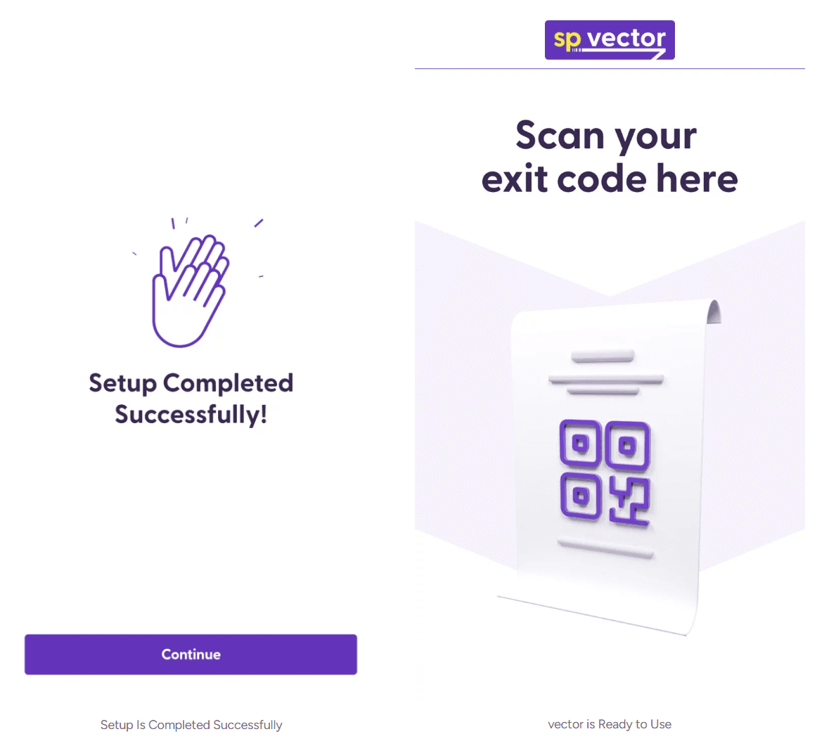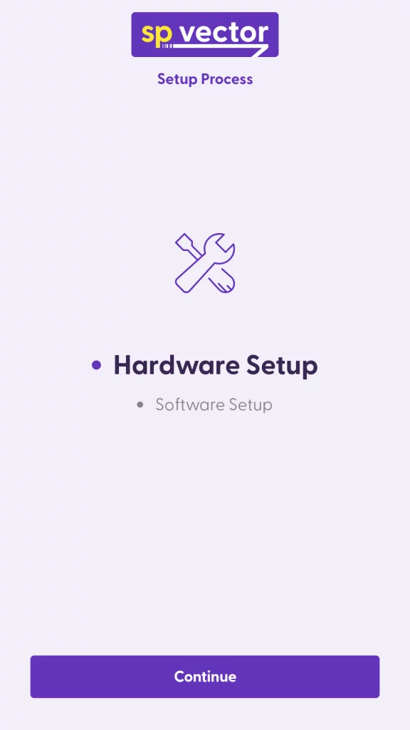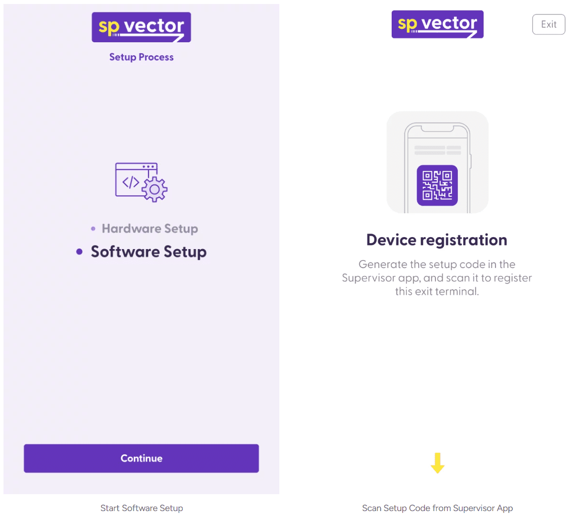 To start the software setup, tap on “Continue”. On the “Device registration” screen, you will need to generate the setup code from the Supervisor app and scan it. Please review this article if you need more information about the vector setup code.
