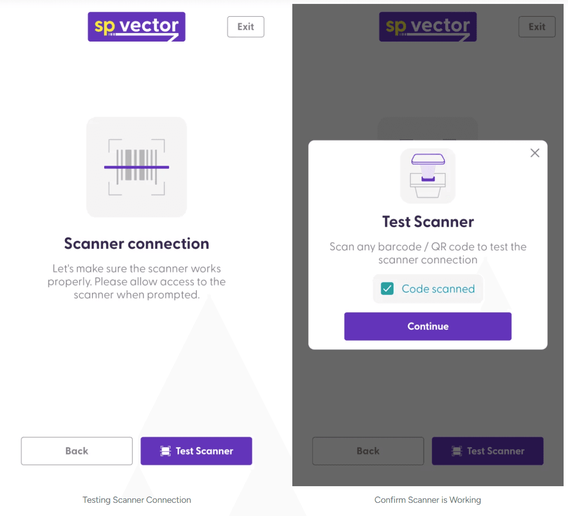 Then, the app will verify that the scanner is working. Click on “Test Scanner” and scan any barcode or QR code. After a successful test, you will see the confirmation that the code was scanned. Click on “Continue”.