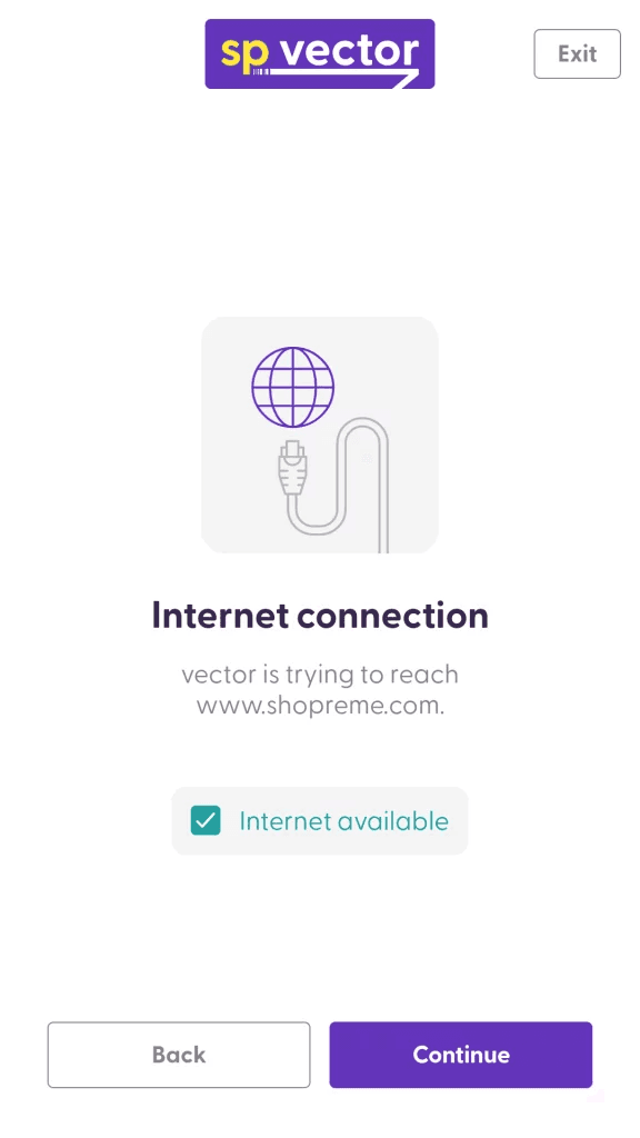 If you receive an error message, please get in touch with your IT/Network team for further assistance. The software setup, which comes after the hardware setup, requires connection to the Internet to register the vector to your store. However, you can stop the configuration (turn the device off) at this point to continue later, if needed.