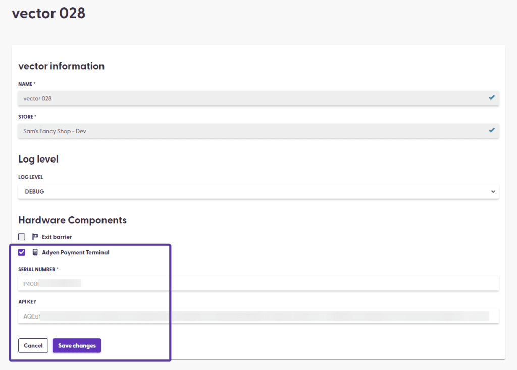 After adding the new payment terminal, the vector page will show that the Terminal is Enabled, along with the Serial Number and API key ending. Verify this information is correct!