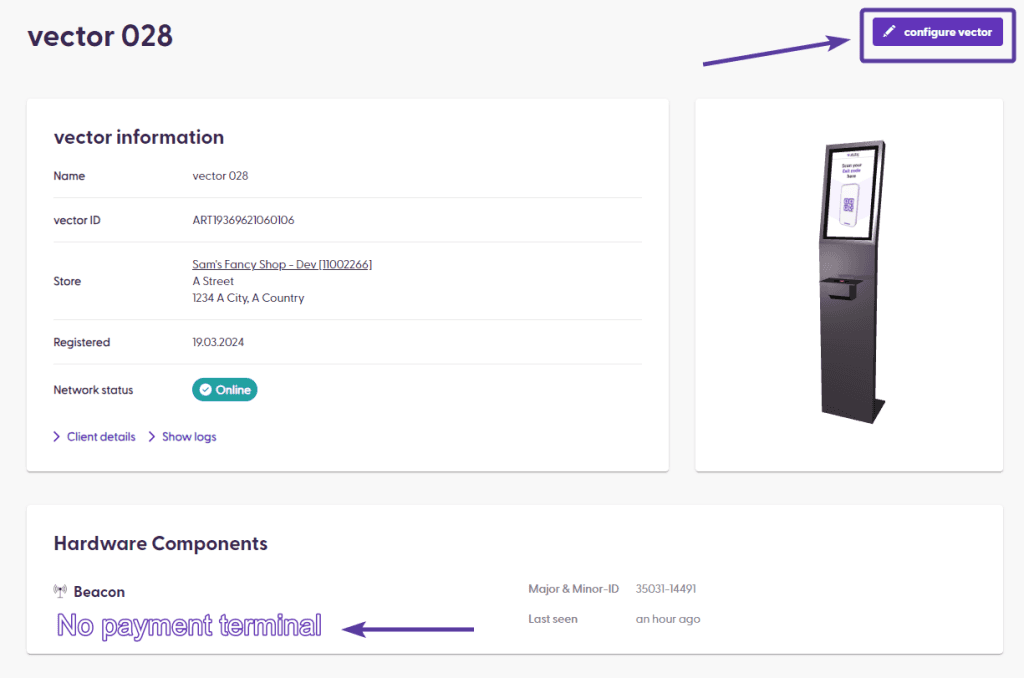 To configure the new PoS Terminal, first check that the Payment Terminal is not listed in the vector management detail page. Then, click on “Configure vector” on the top right corner: