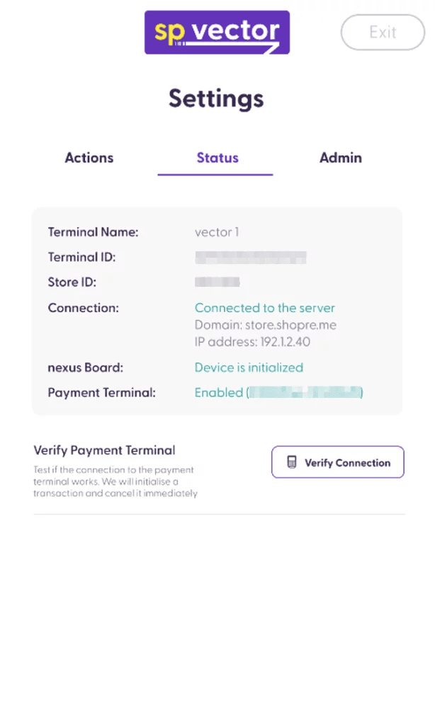 After configuring the PoS Terminal in the Management Console, go to your vector to test the setup. If vector is currently showing the Settings page, please tap on “Exit” on the top right corner. Then, rescan the QR-code to reopen the Settings page on the vector screen. This ensures that the vector device will refresh and reload the new configuration you just modified in the Management Console.