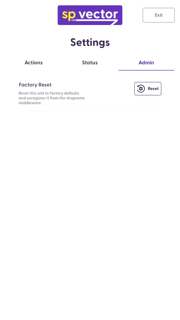 Factory Reset: This option unregisters your vector from your server, so then you can restart the Hardware and Software Setup process. This can be used in case the vector device is transferred from one store to another.