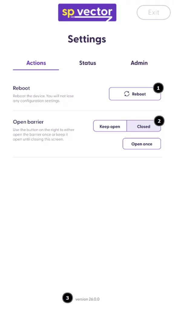 The Settings page on the vector app has three tabs: Actions, Status and Admin. Below you can see the main functionalities included in these three tabs.