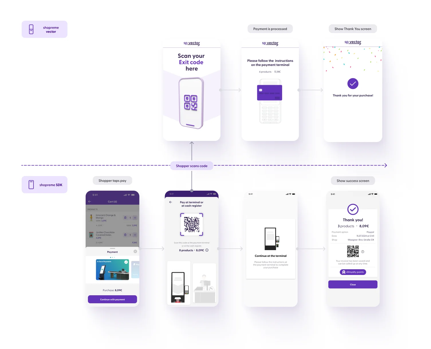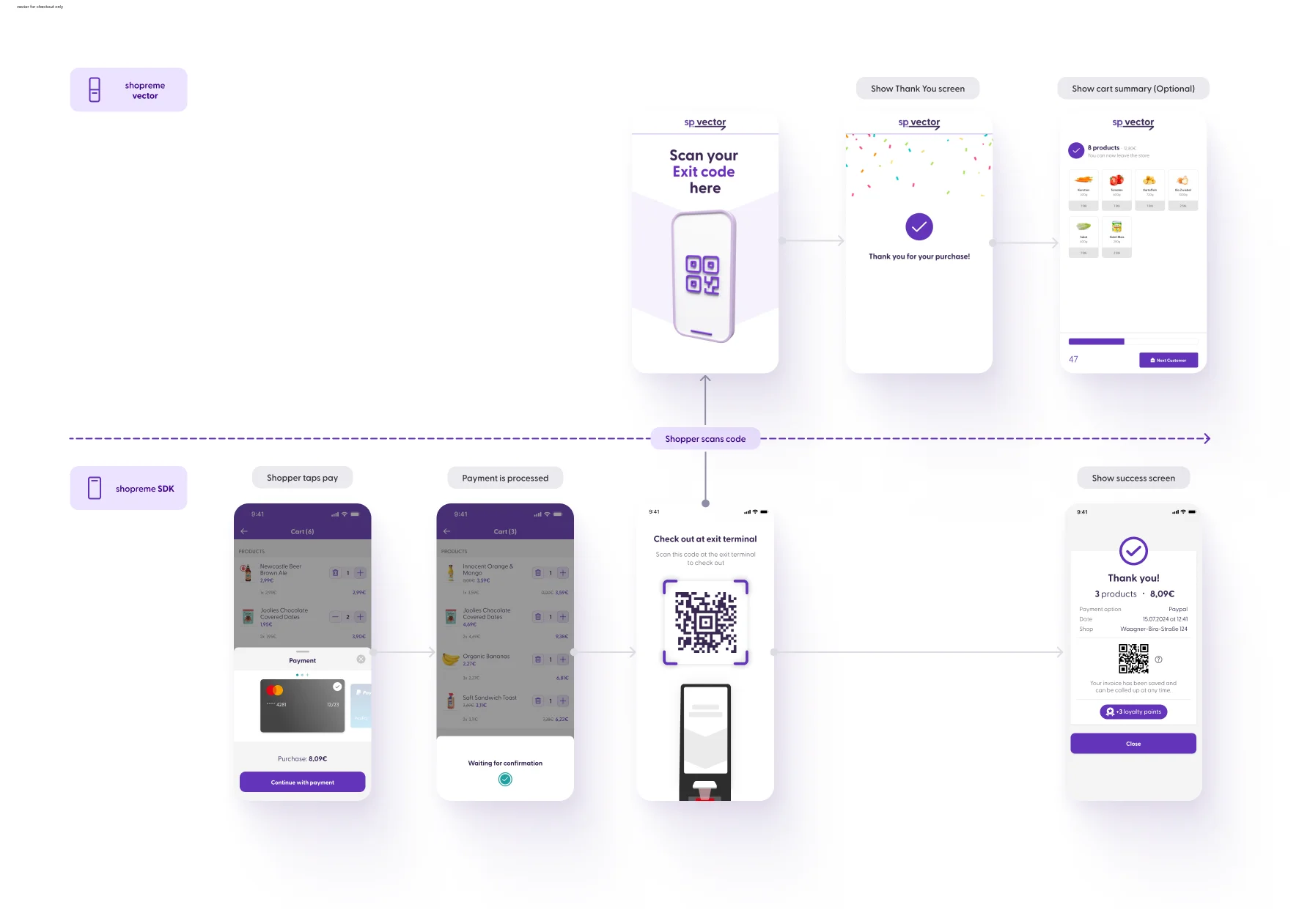 When a customer scans their QR Code to check out, shopreme vector will verify the information on the QR code for receipt validity, timestamp, and store location. If everything is confirmed, the vector will show a success screen and open the gate (if available) to allow the customer to leave the store. After a set amount of time, the screen will return to the idle-screen animation.