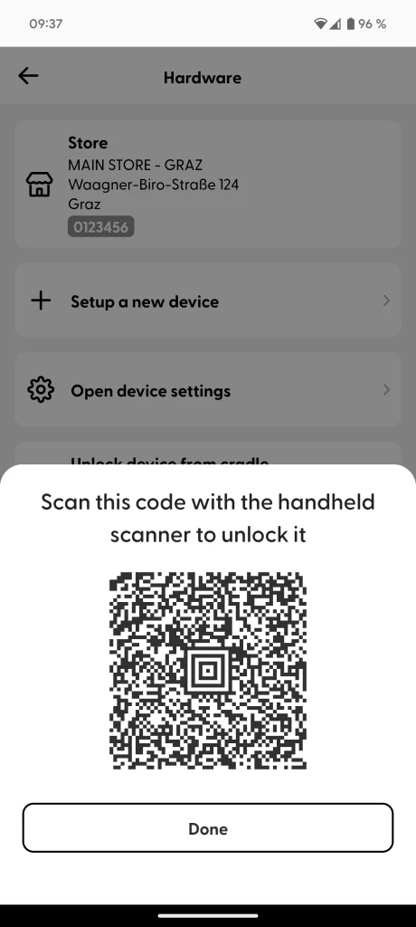 In the Supervisor app, similar to where the Setup code is found, there is another code called “Unlock device from cradle”. This code can be scanned at any portable scanner that is docked in a cradle, and it will unlock itself. This method can be helpful while troubleshooting any technical issues, such as connection to the shopreme backend or the Google Cloud Messaging service.