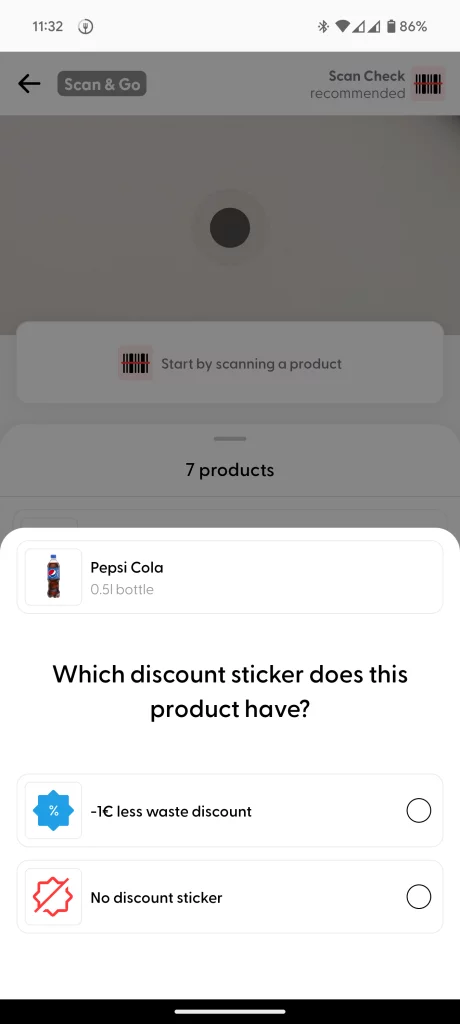 Product quantity = 1, available discount options > 1: As different discount types are available for this product, the shopper will need to confirm the type of sticker the product has, by first tapping the sticker type and then “Apply discount” (Picture 6).