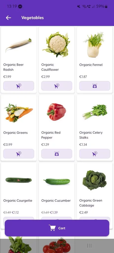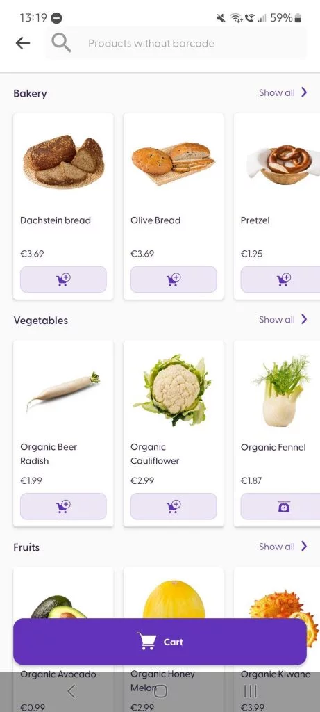 For products without barcodes, our shopreme SDK includes the “category browsing” feature in the scanner view. You can find this section when tapping the magnifying glass icon. Customers see a page of products, which can be grouped into custom categories. Tapping on “Show all” will bring up all products within that category. Simply tap on the purple add-to-cart icon for the product wanted and adjust the quantity as needed.