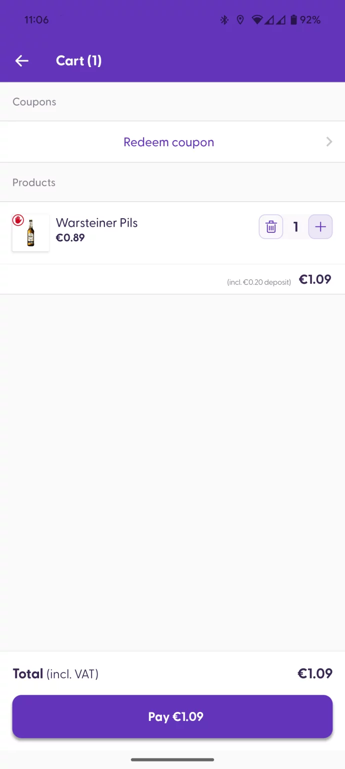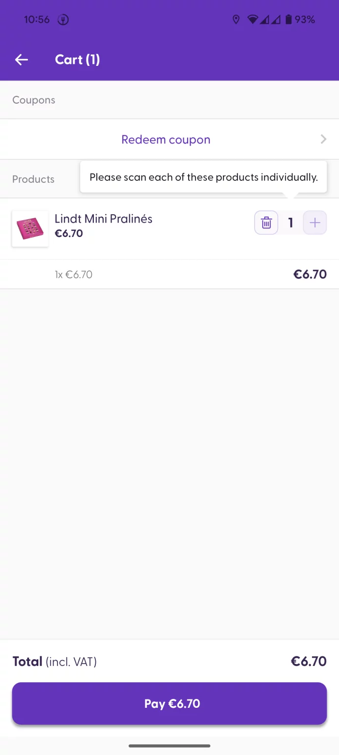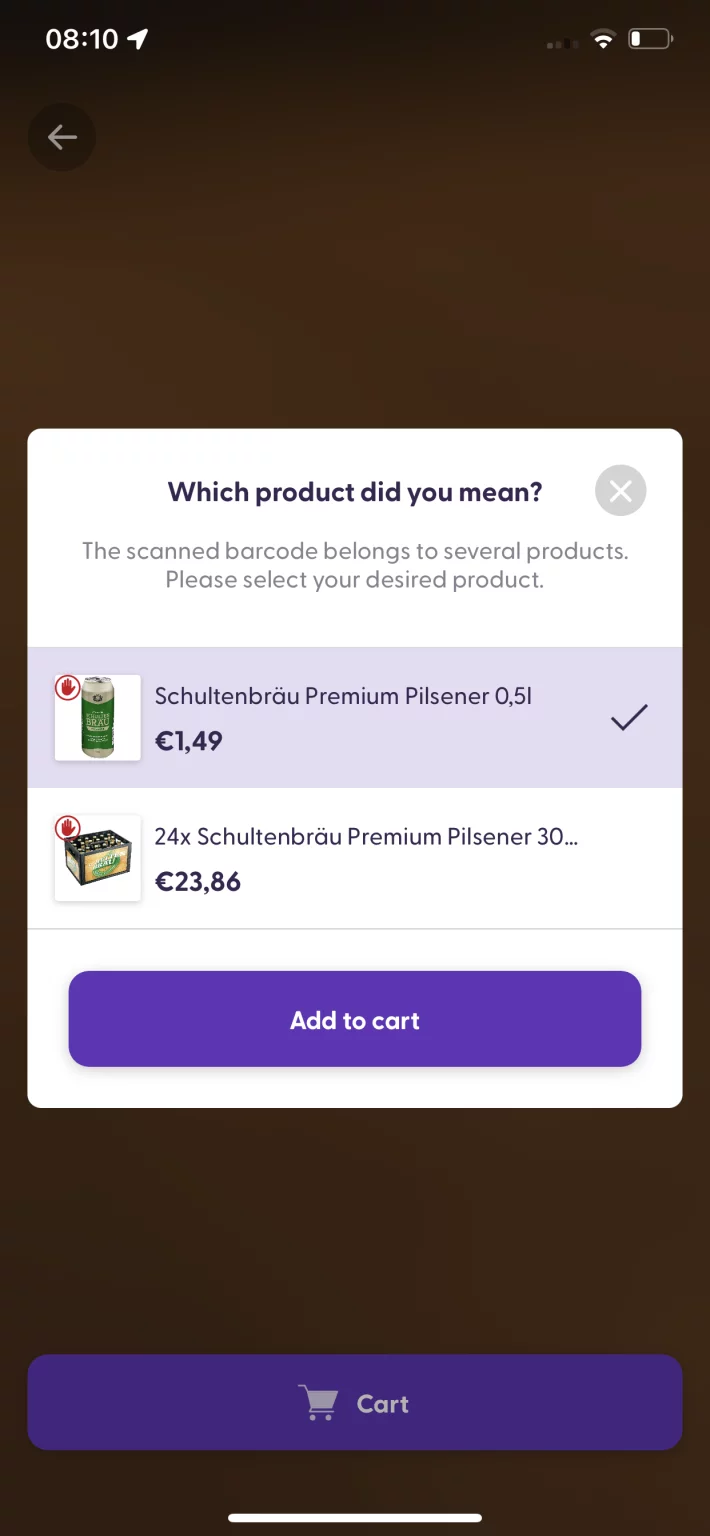 Some products with special prices or customized ingredients can only be scanned individually. This means that the quantity cannot be increased on the cart screen. The “+” button will be grayed out, and tapping it will show a message explaining that this type of product can only be scanned individually. To add more items of the same product, you will need to scan it again.