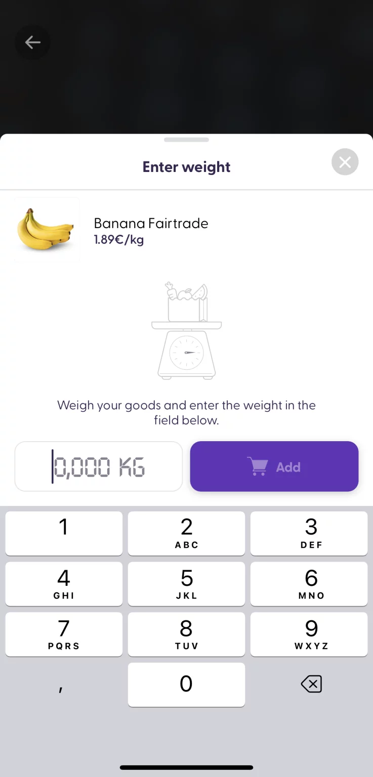 Some products, usually fruits and vegetables, may be configured to be weighted before they can be added to the shopping cart. First, you choose your products and weigh them on a physical scale at the store. Then, when you scan this product barcode, you will see a new screen where you need to enter the exact weight you see on the physical scale.