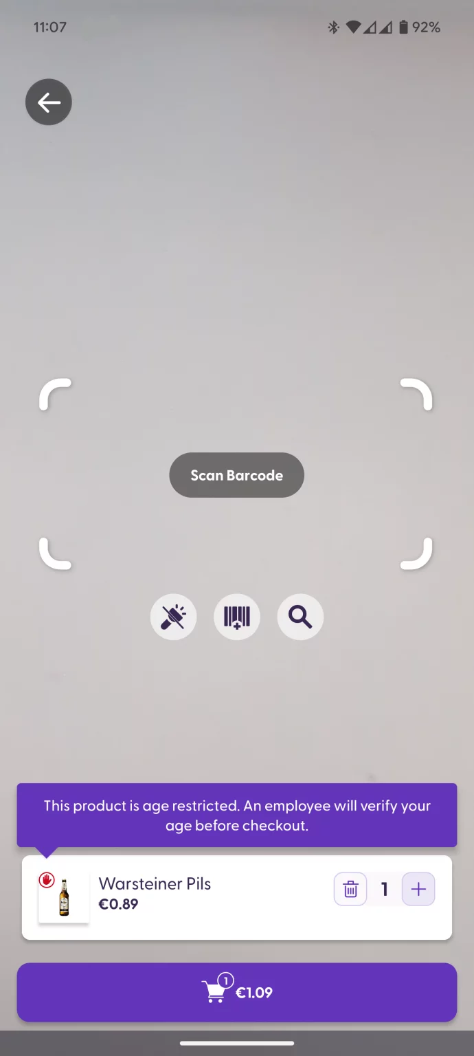 When you scan a product that is restricted to customers over a certain age, you will see a small red hand icon on the corner of the product picture. A message will also appear to let you know that the product you have scanned requires that you be checked before leaving the store.