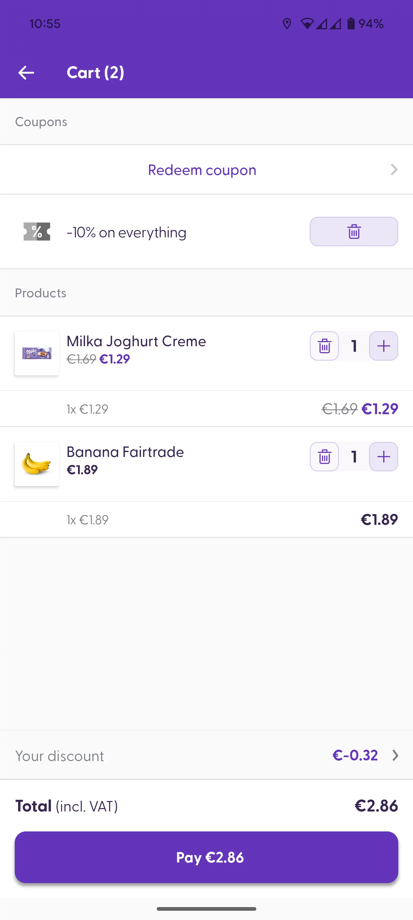 Scan your coupon QR codes using your scanner feature; if they are valid, they will be added to your basket automatically.