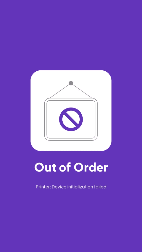 The manually-enabled out-of-order screen is launched from the Settings page, which can be opened by scanning the “Open settings” code in the Supervisor app. This screen does not include a description of the error, so this helps differentiate the cause of the “out of order” screen.