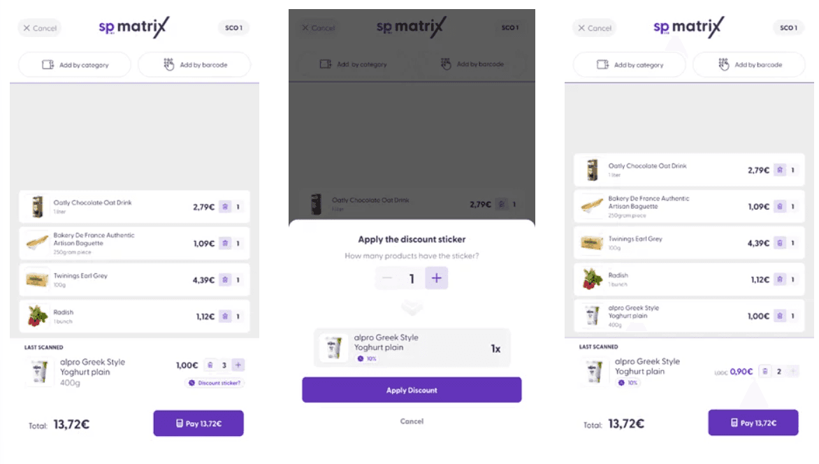 On the matrix SCO, when the shopper scans a product that allows having a discount, the option “Discount sticker?” will be displayed under the product quantity buttons. When tapping on this option, a menu will appear for the shopper to confirm the number of products that have the promotional sticker, and the stickers and updated price will be added to the cart.