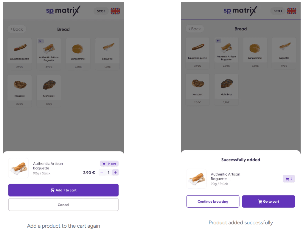 Inside each category, the individual products will be listed, and the shopper can click on them to add them to the cart. If the selected product already includes a unit in the cart, there will be an icon above the quantity button (as in the example below: 1 item of this bread type is already added to the cart). Adding one more to the cart will lead to a confirmation dialog with the total number of specific items in the cart. The shopper can then confirm whether to continue browsing and adding products without barcodes or go to the cart to proceed with their payment.