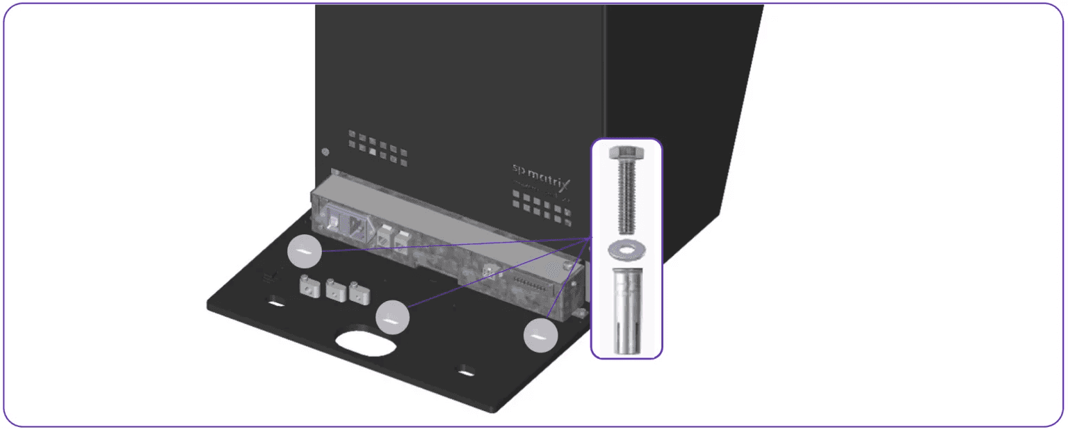 To mount the matrix, it is necessary to anchor it firmly to the ground. This anchoring consists of three fastening points on the base plate, which require the provided flush anchors, screws and washers (M10).