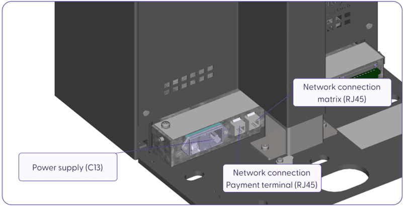 The matrix is a plug-and-play device. The power supply is via a cold-device plug, and it has two Ethernet ports. One of these two ports is used to operate the payment terminal. To connect the matrix, it is required to have: