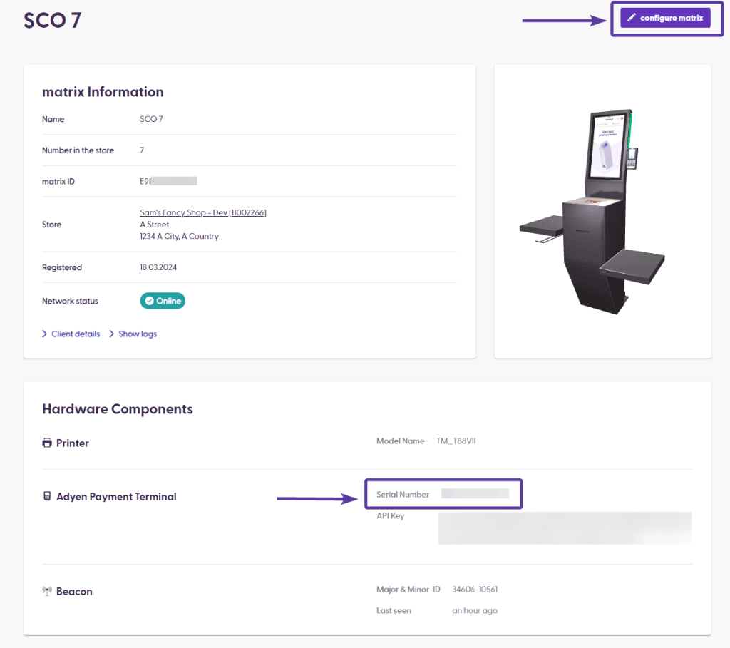 To configure the new PoS Terminal, first check that there will be no Serial Number for the Payment Terminal yet. Then, click on “Configure matrix” on the top right corner:
