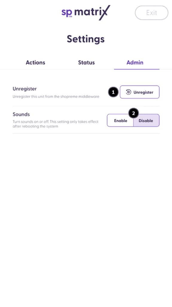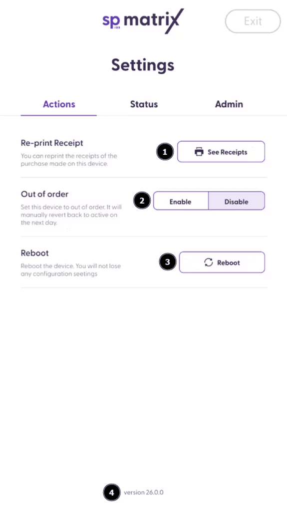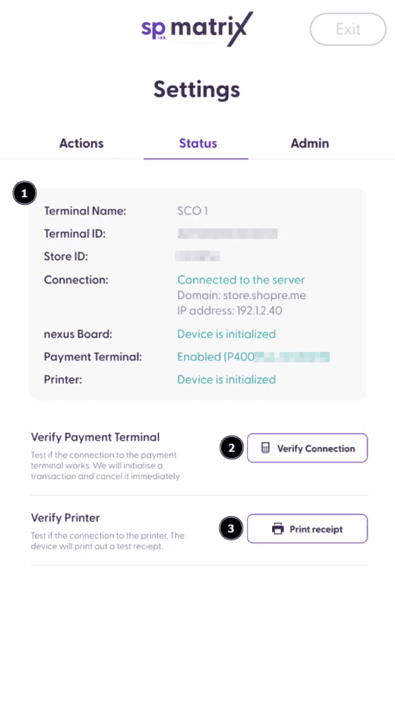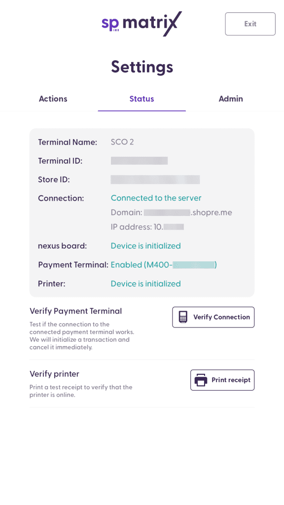 After configuring the PoS Terminal in the Management Console, go to your matrix to test the setup. If the matrix is currently showing the Settings page, please tap on “Exit” in the top right corner. Then, rescan the Aztec-code to reopen the Settings page on the matrix screen. This ensures that the matrix device will refresh and reload the new configuration you just modified in the Management Console.