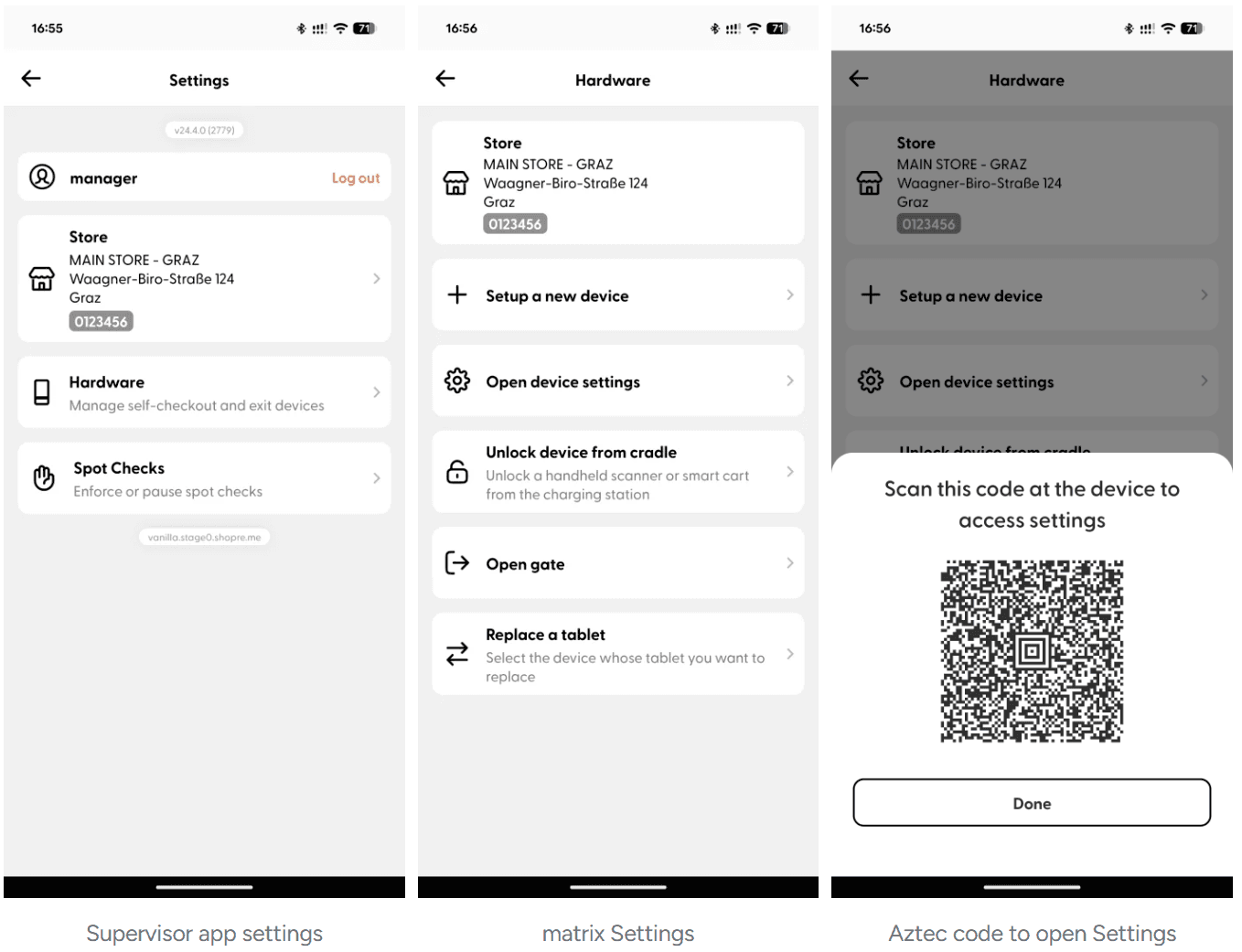 To access the Settings, you will need access to your Supervisor app. In the Supervisor app, go to Settings, then “Hardware”, and then to “matrix”, and then choose the option “Open matrix settings”. Finally, scan the Aztec code displayed with the matrix scanner.