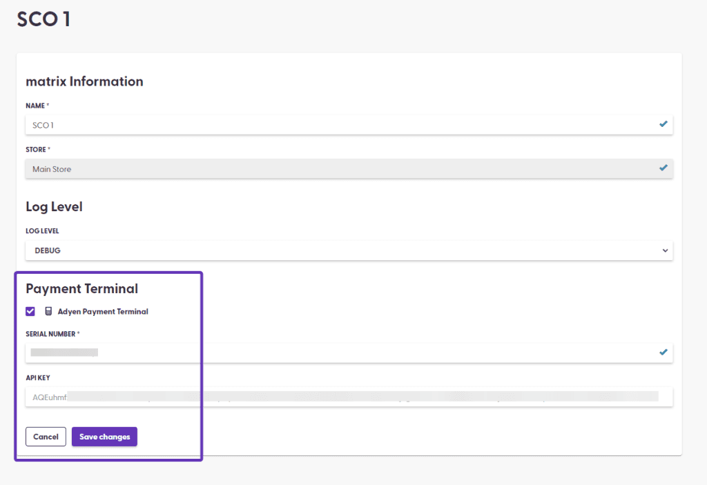 After adding the new payment terminal, the matrix page will show that the Terminal is Enabled, along with the Serial Number and API key ending. Verify this information is correct!