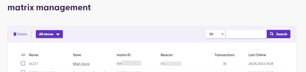 After a matrix is registered, it will appear in this section immediately. You can confirm that the Name and Terminal ID match the information visible in the Configuration Settings and that the Store is correct. You can also see that in the Add-ons column, the Payment Terminal icon is gray as it is not configured yet.