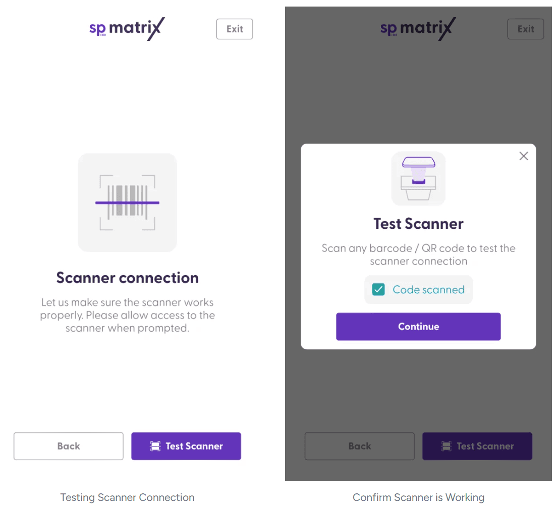 Then, the app will verify that the scanner is working. Click on “Test Scanner” and scan any barcode or QR code. After a successful test, you will see the confirmation that the code was scanned. Click on “Continue”.