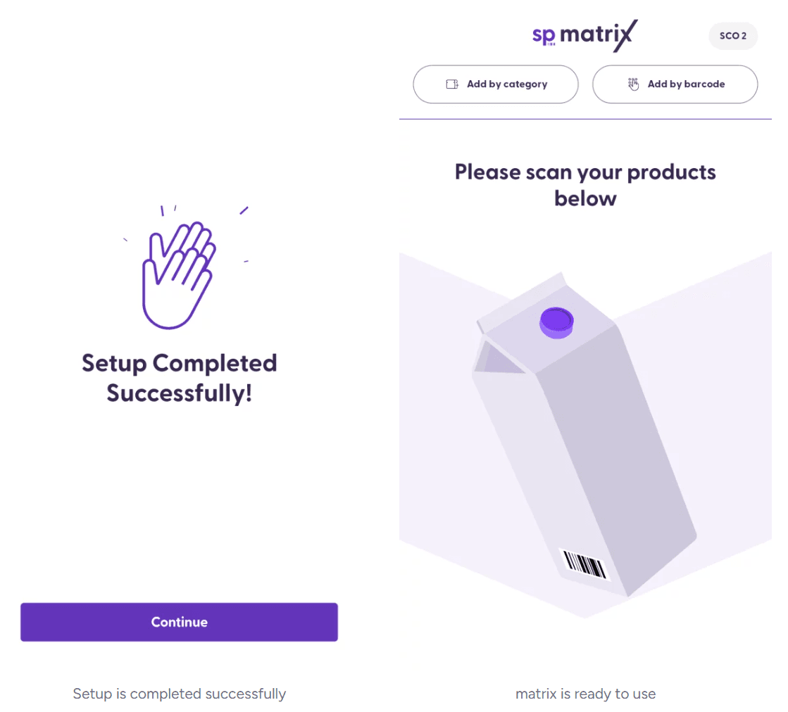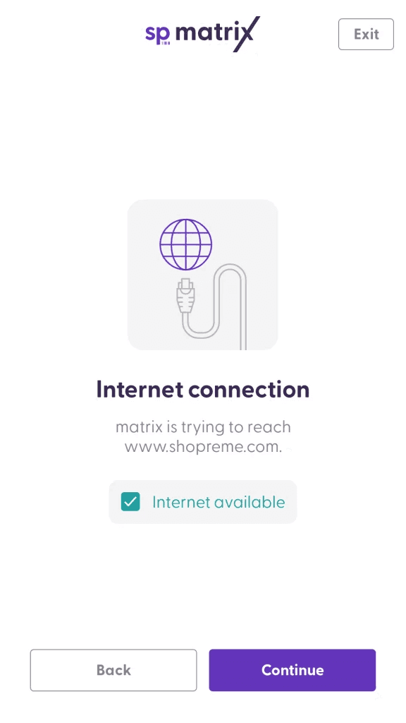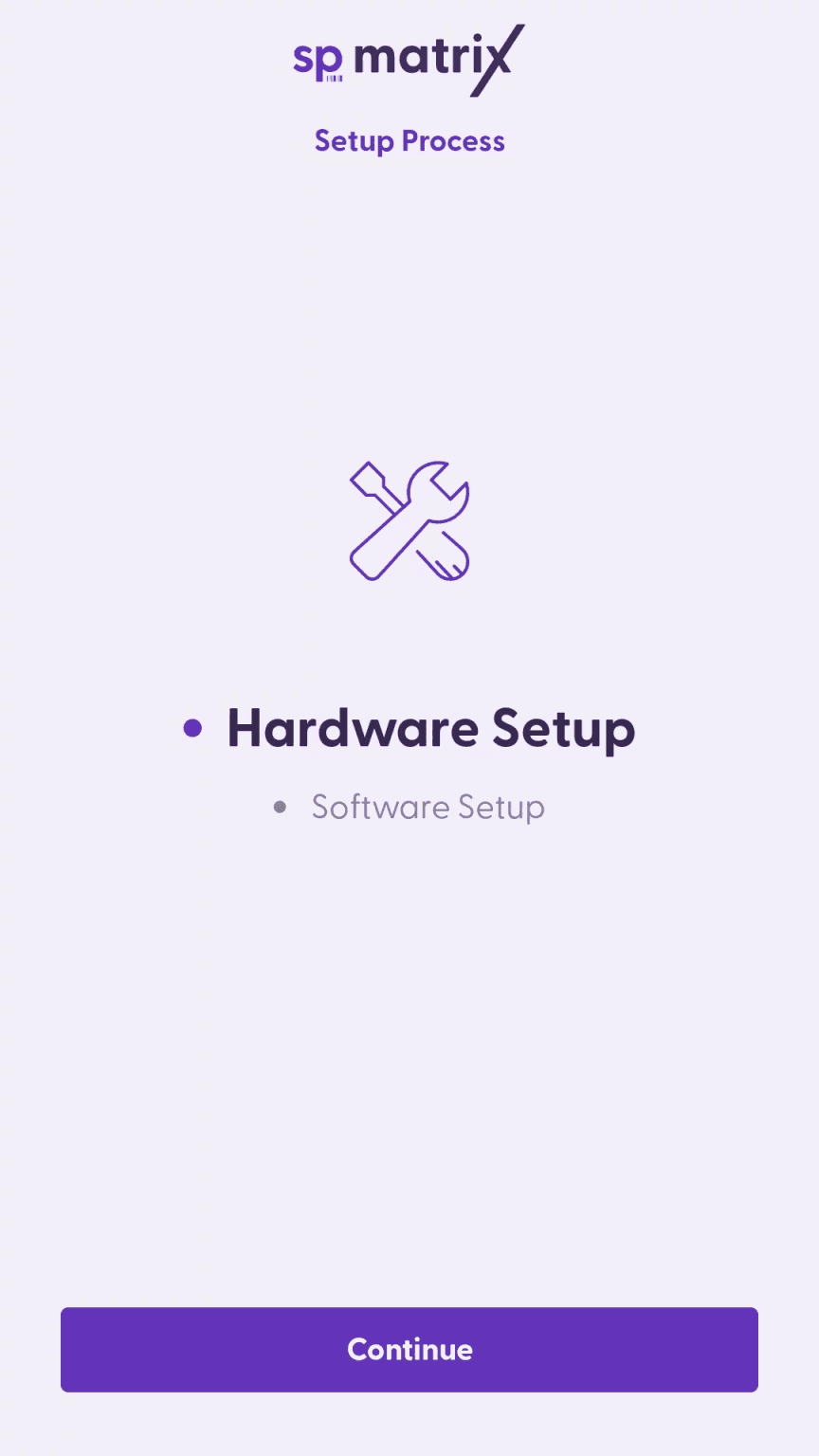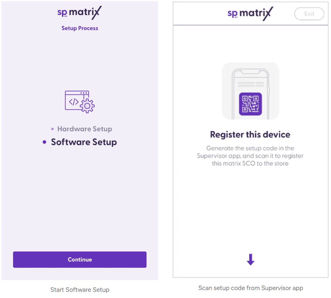 To start the software setup, tap on “Continue”. On the “Scan & Go setup” screen, you will need to generate the setup code from the Supervisor app and scan it. Please review this article if you need more information about the matrix setup code.