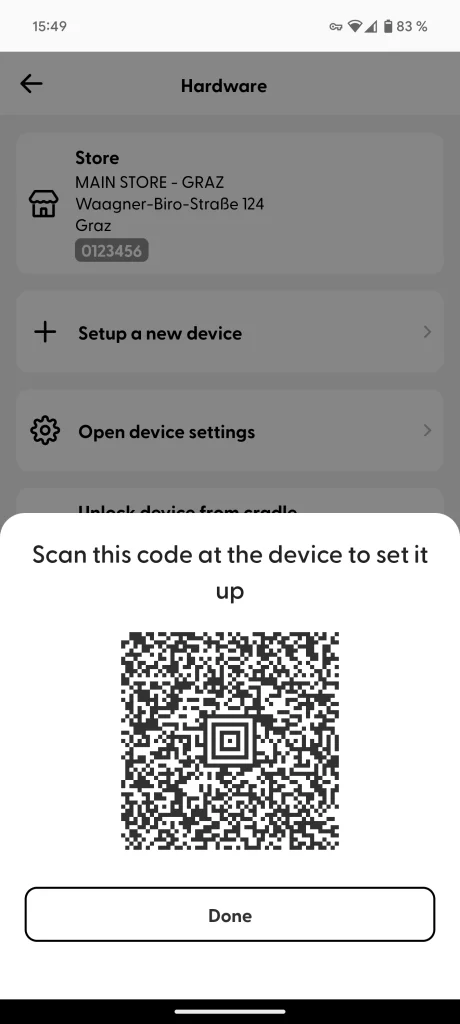 A setup QR code will be generated. Scan it on the snap cart device. The shopreme Scan & Go app will process its content and load configuration and styling information from the server, after which it is ready for use.