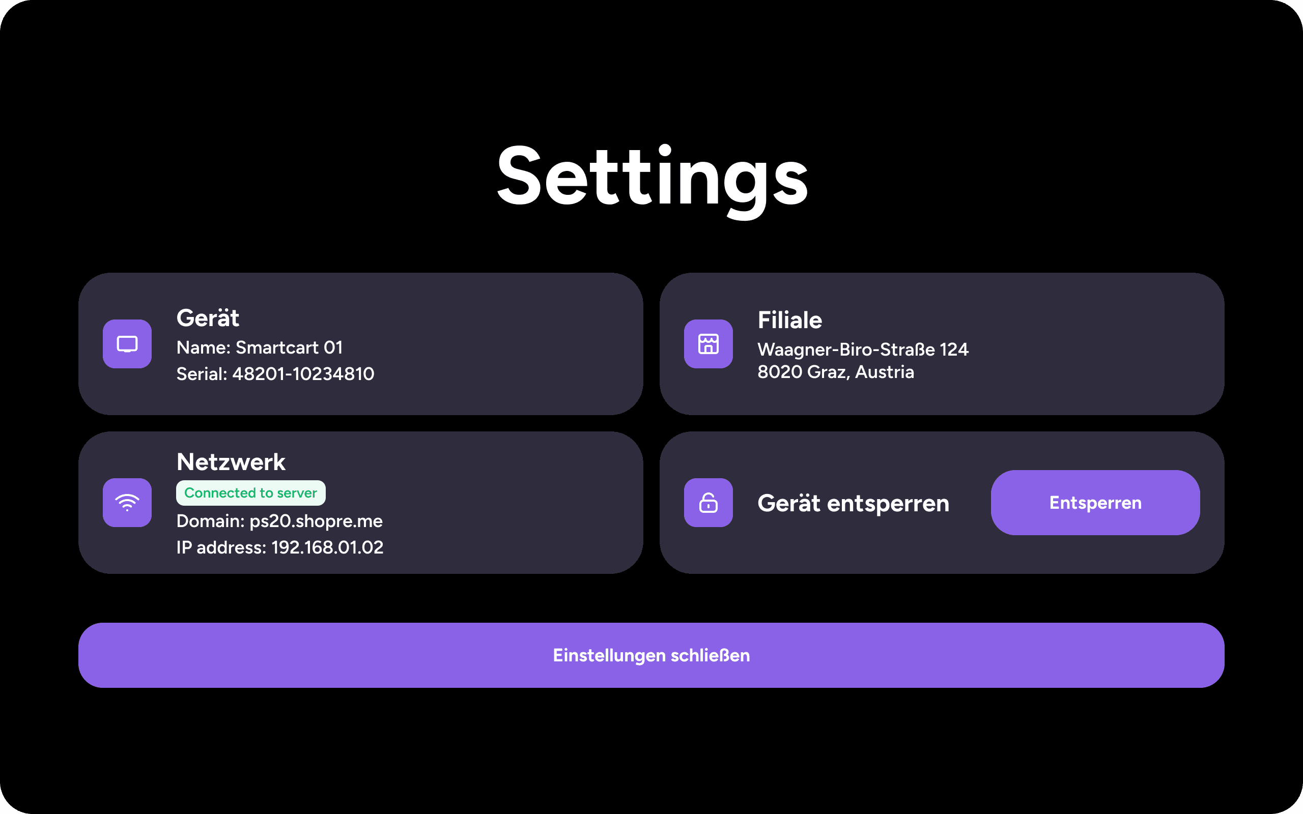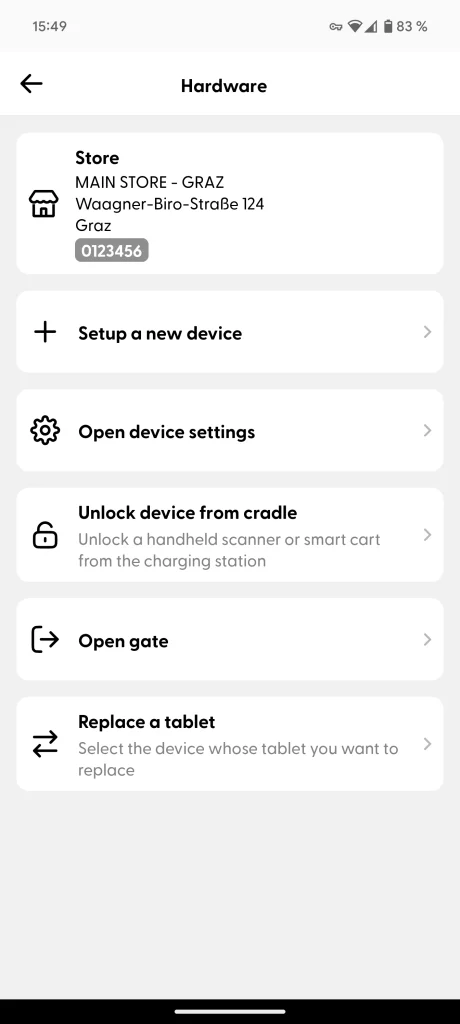 The Supervisor app user can scan the “Open devices settings” code at the snap cart, to see the current configuration of the device. For example, the current network name, IP address, and store ID can be verified here.