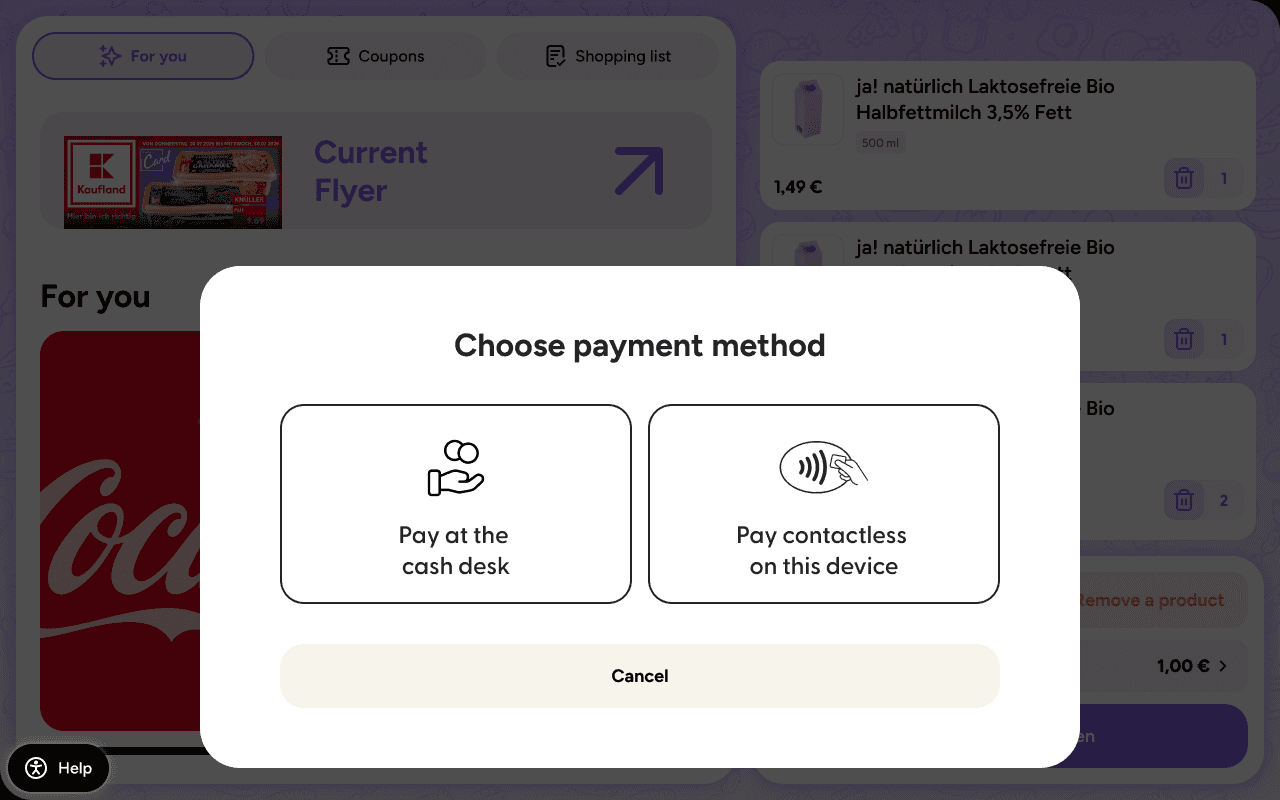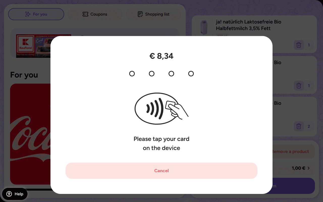For hardware equipped with more advanced payment integration, shoppers may also be able to pay directly at the cart using NFC (near-field communication). In this case, the shopper taps a supported card or mobile wallet on the tablet to complete the payment instantly. The chosen payment options depend on the store’s backend configuration and the tablet’s hardware capabilities.