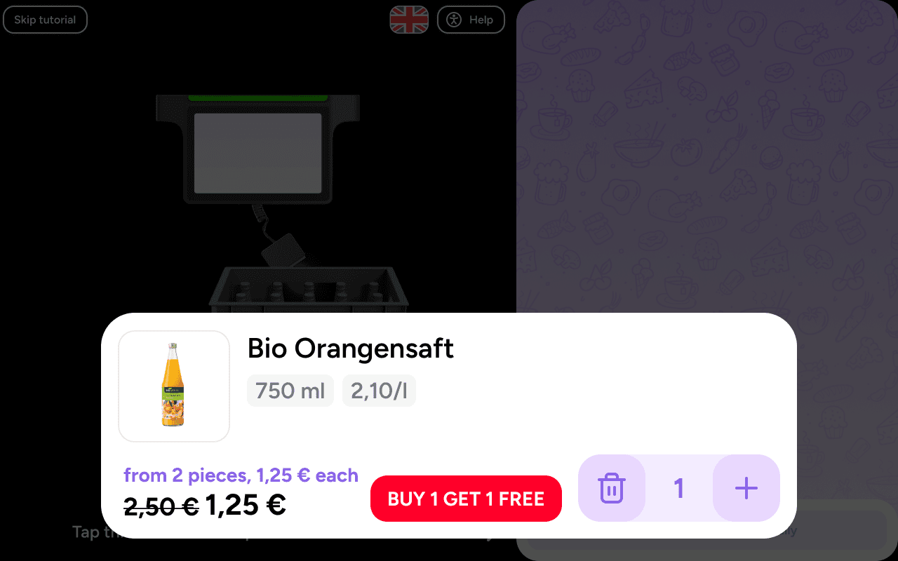 After the onboarding tutorial and scanning more products, the cart will show all the scanned products on the right side, while also display other available functionality and retail media on the left side (this requires backend compatibility).
