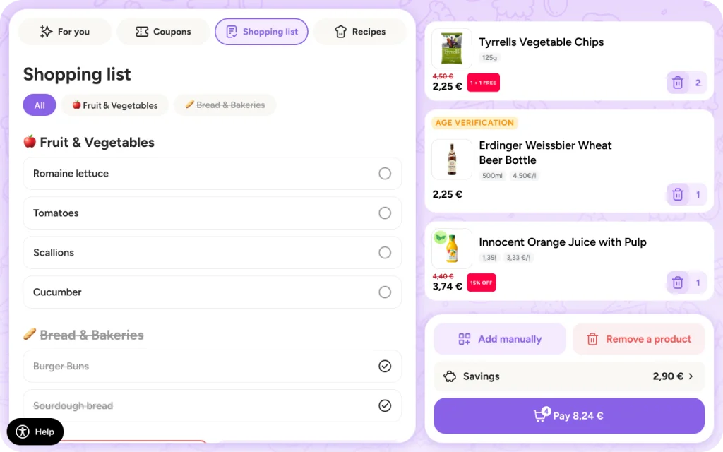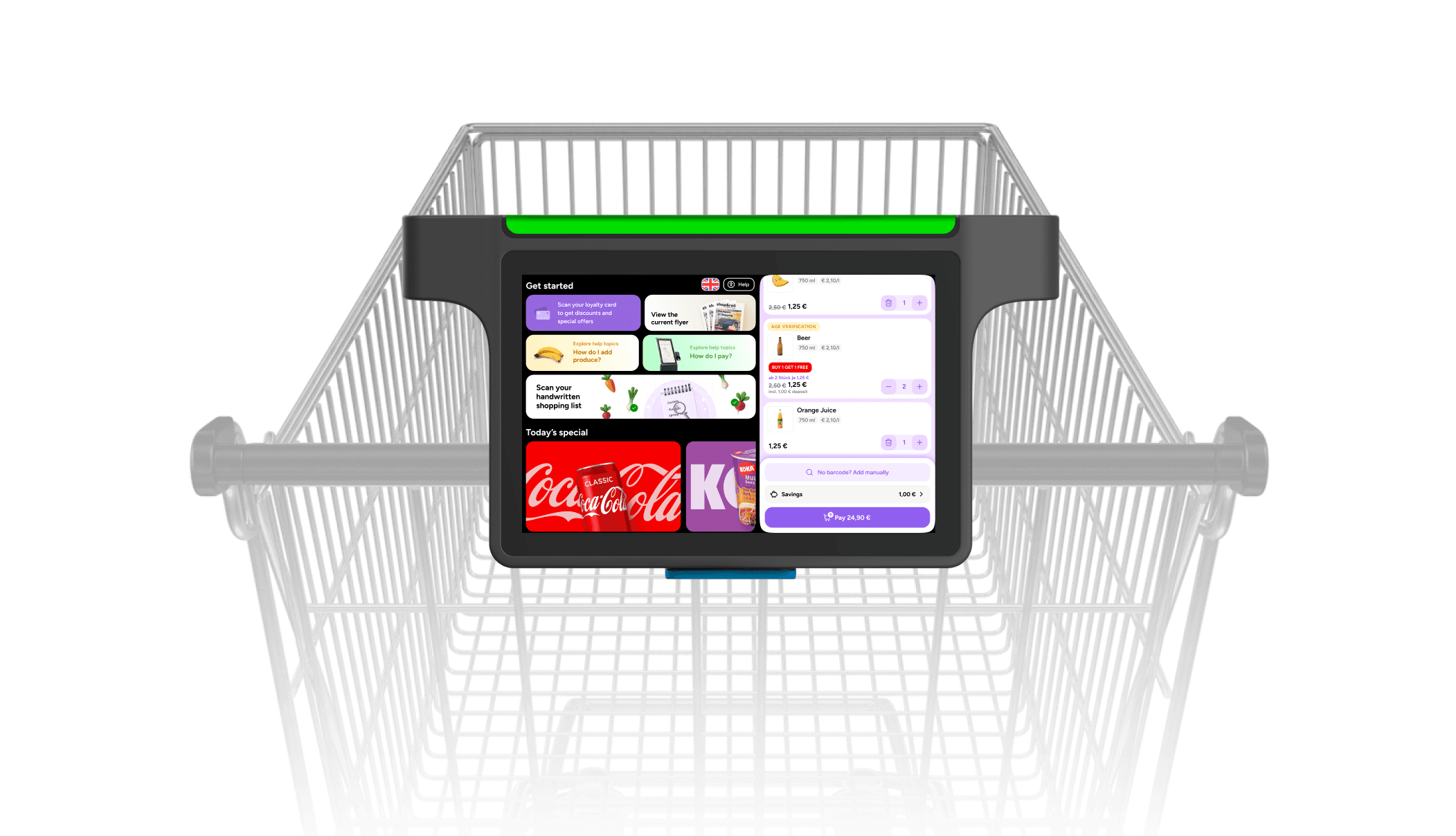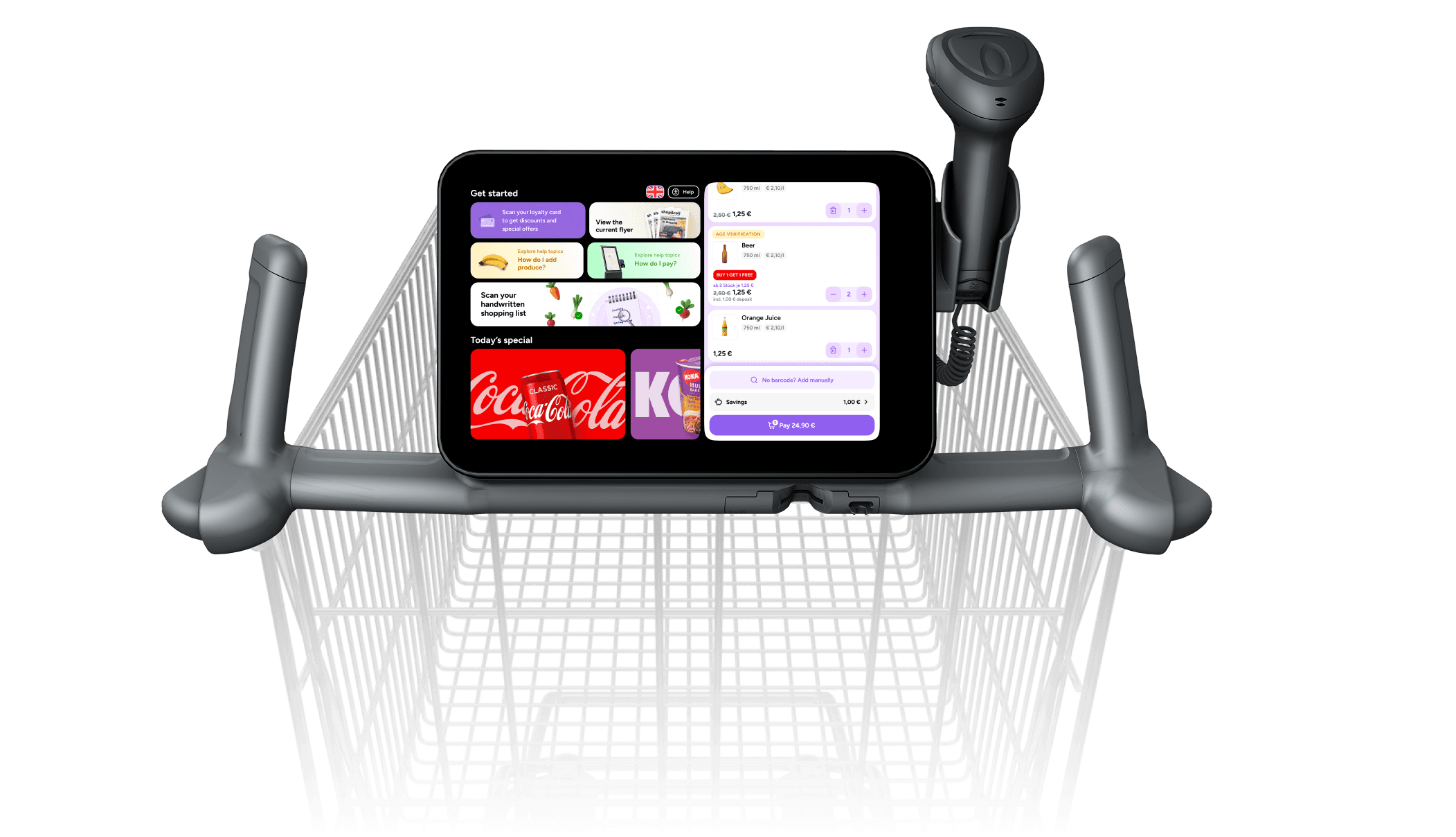 The shopreme smart cart offers a fully integrated Scan & Go experience directly from the shopping cart, without a smartphone. It empowers customers to scan products, track their purchases in real time, and pay using multiple methods, all from a tablet mounted on the cart. Depending on the hardware setup, this tablet may either be embedded into the cart or docked in a charging station from which customers retrieve it at the beginning of their shopping journey.
