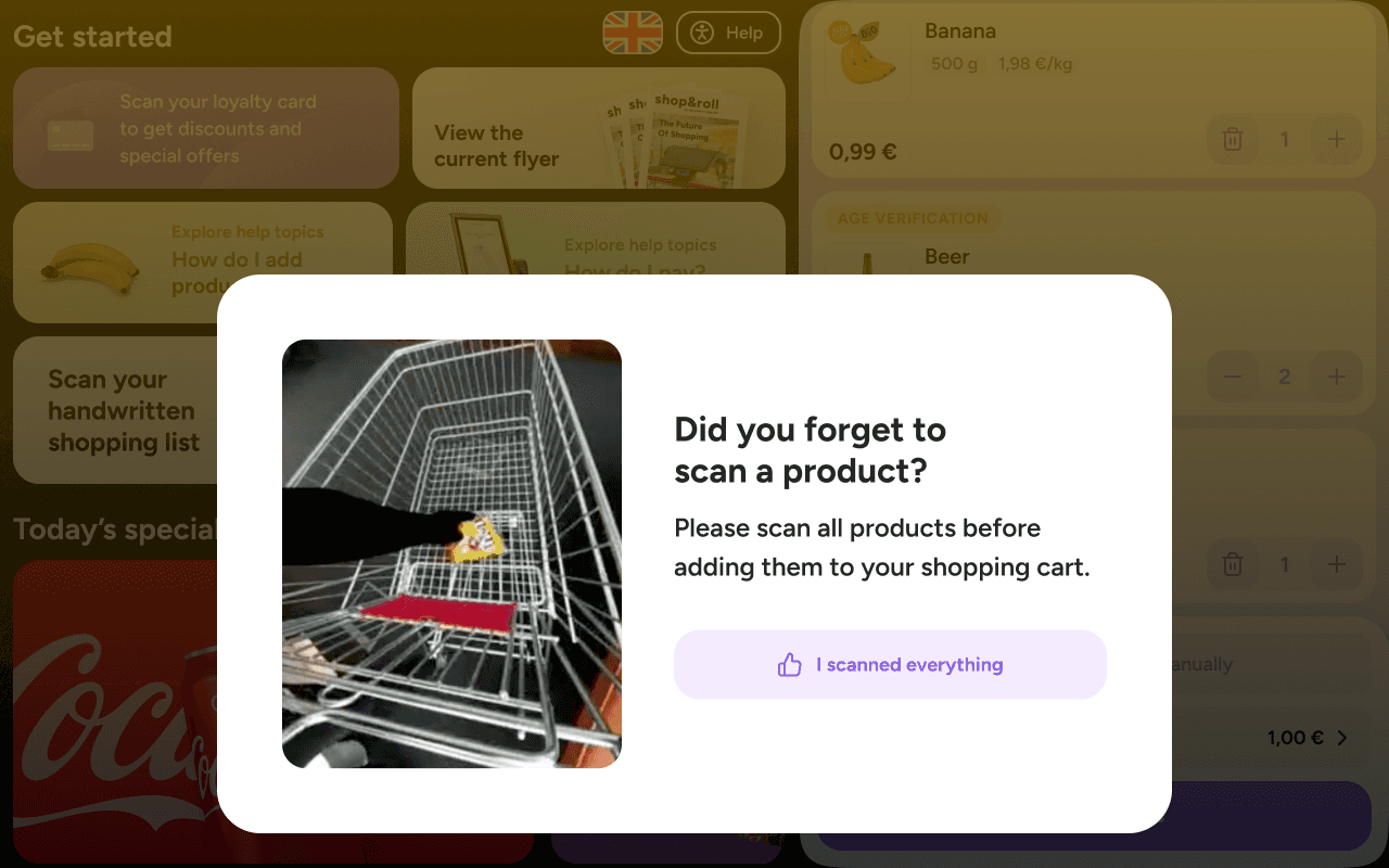 Thanks to the hardware cameras with built-in AI-powered loss prevention measures, the app can identify when a customer places the item in the cart without scanning it — this is configurable according to the retailer's preferences and needs. If this occurs, a pop-up alert will be displayed to the shopper: