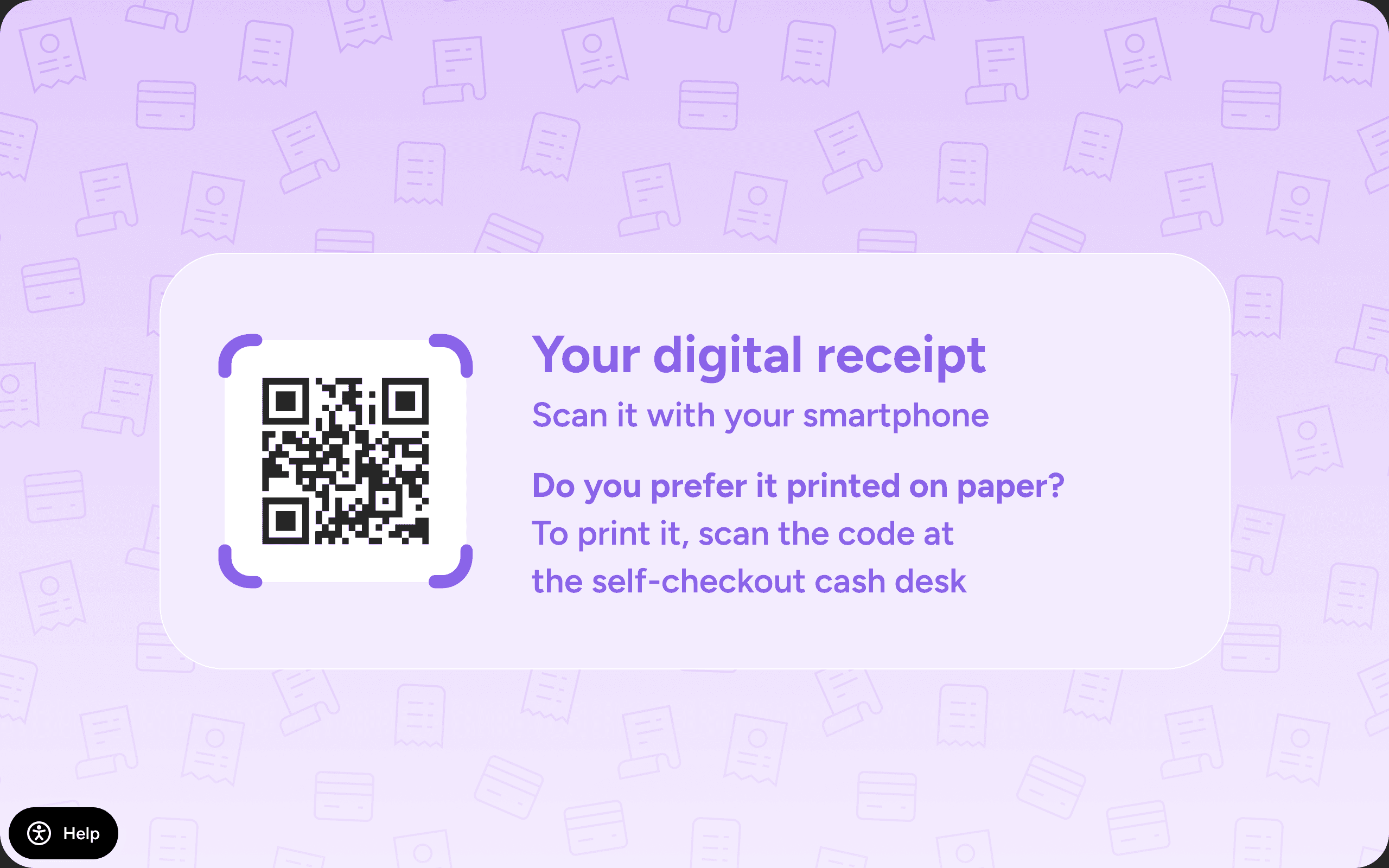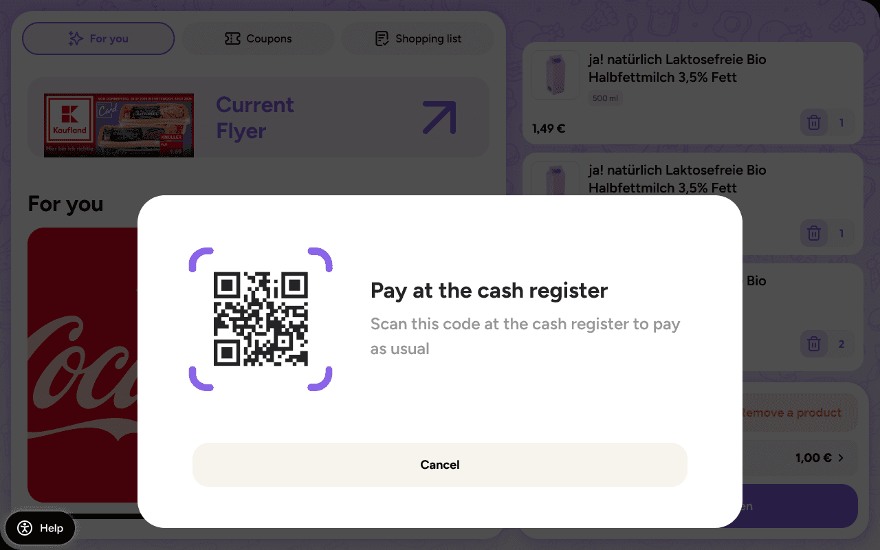 In this case, the snap cart app will show a Payment QR code to transfer the scanned products to the cash register, and the shopper can pay as usual, either by cash or using a payment terminal: