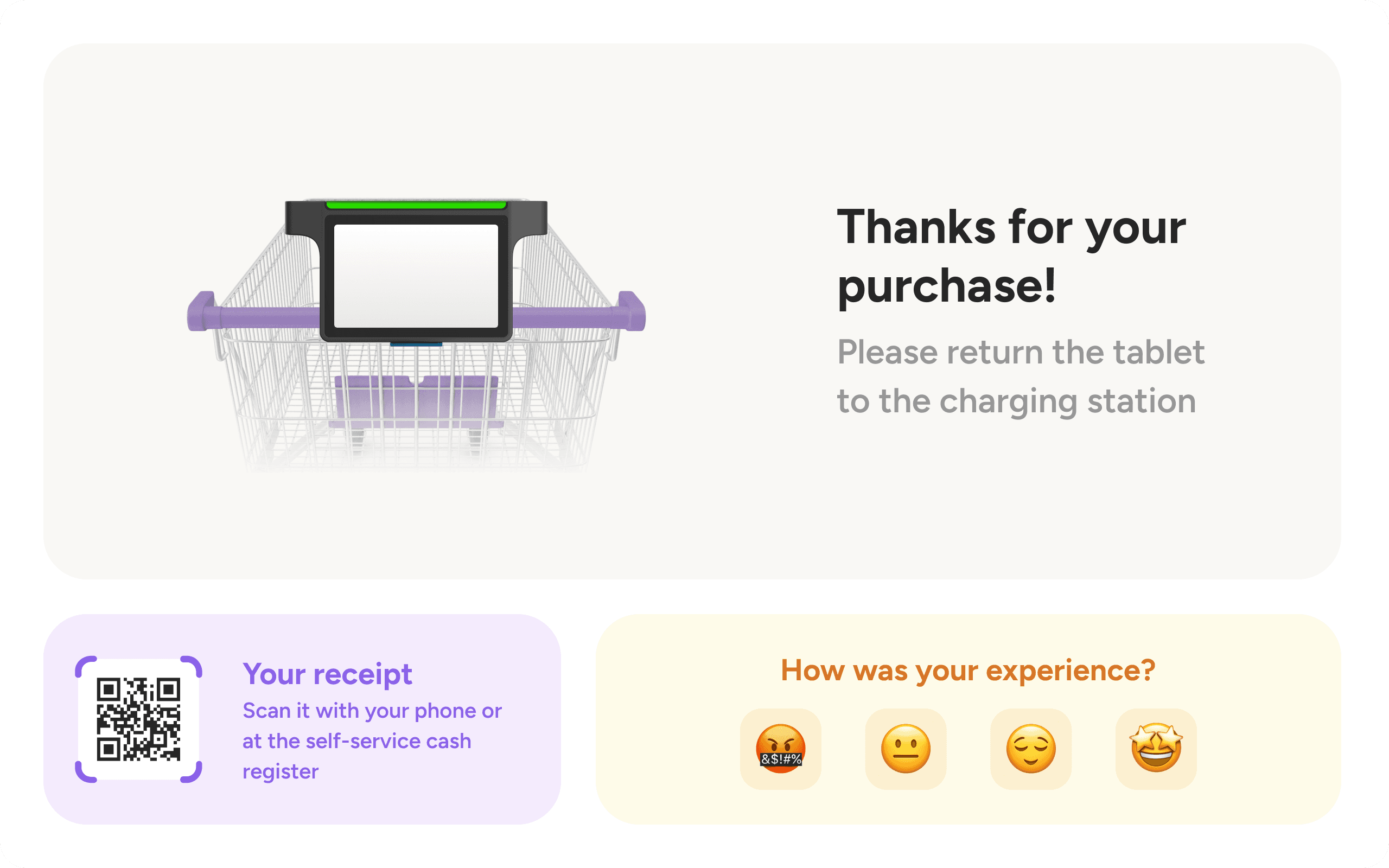 For carts with embedded tablets, there is no return process. Once payment is completed, the shopper receives a digital copy of the payment receipt and is asked to return the cart to the designated area within the store.