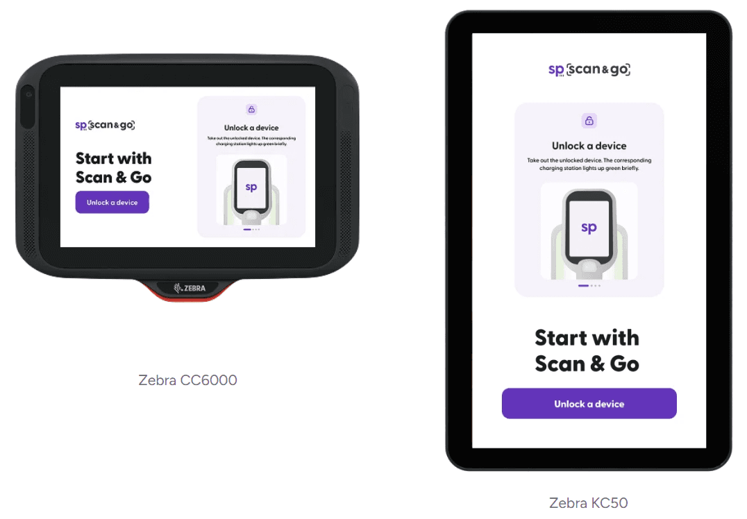 It consists of a tablet with a scanner or text input, where shoppers can scan their loyalty card or membership QR code. Once the user authenticates, they can see if a portable scanner is available (either a handheld scanner or a snap cart), and take a device from the charging station.