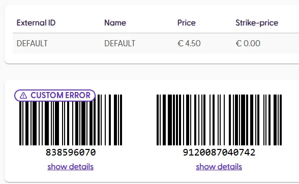 In addition to general error messages, it is possible to determine the expected behavior for incomplete barcodes. As we previously mentioned, special EANs may require to have encoded weight, price, or unit information to be scannable by customers. However, it may be possible to determine the behavior of the empty template barcode. Following the same example from before, if the scannable barcode is 2298331022501, then the empty template would be 2298331000001 (the unit information is not included).