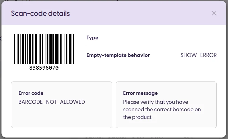 messagefield in thescanErrorobject can be translated in the Scan & Go customer app by registering thecodeusing the ShopremeCore SDK. The default message imported to the Management Console will be displayed if no translation is available.