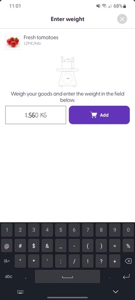 | Scanning the empty template barcode will trigger the “manual input for weight” screen on the customer’s app. This allows the customer to enter the weight of the product as displayed on the scale in the store. |