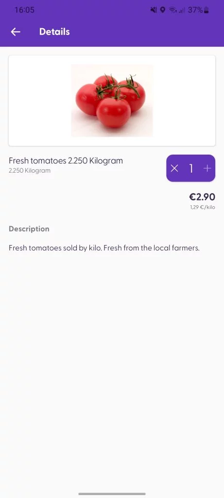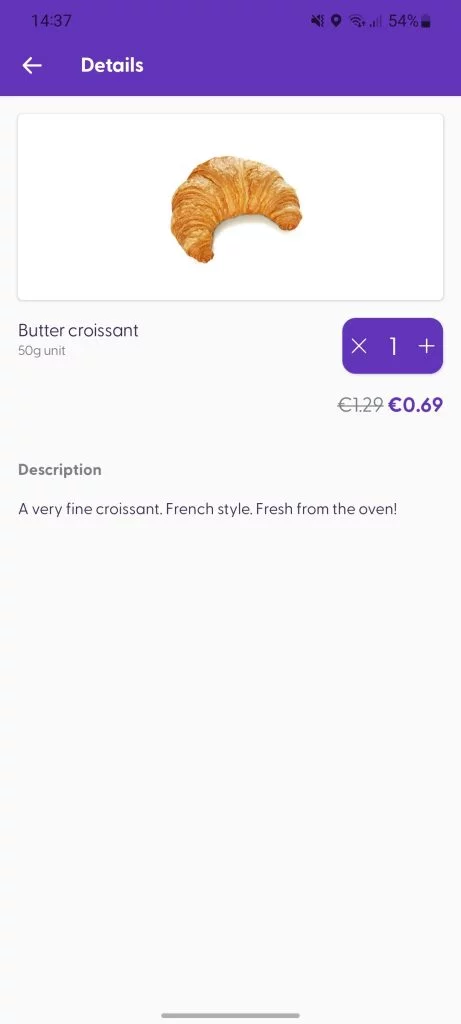 As soon as the product is available in the Management Console and has a barcode and a price, it can already be scanned by customers using Scan & Go (assuming the cart evaluation is done by shopreme and no further adjustments are necessary on the cash-register side to be able to process the final price of the product). Here is an example of what the imported data will look like on the end-user side:
