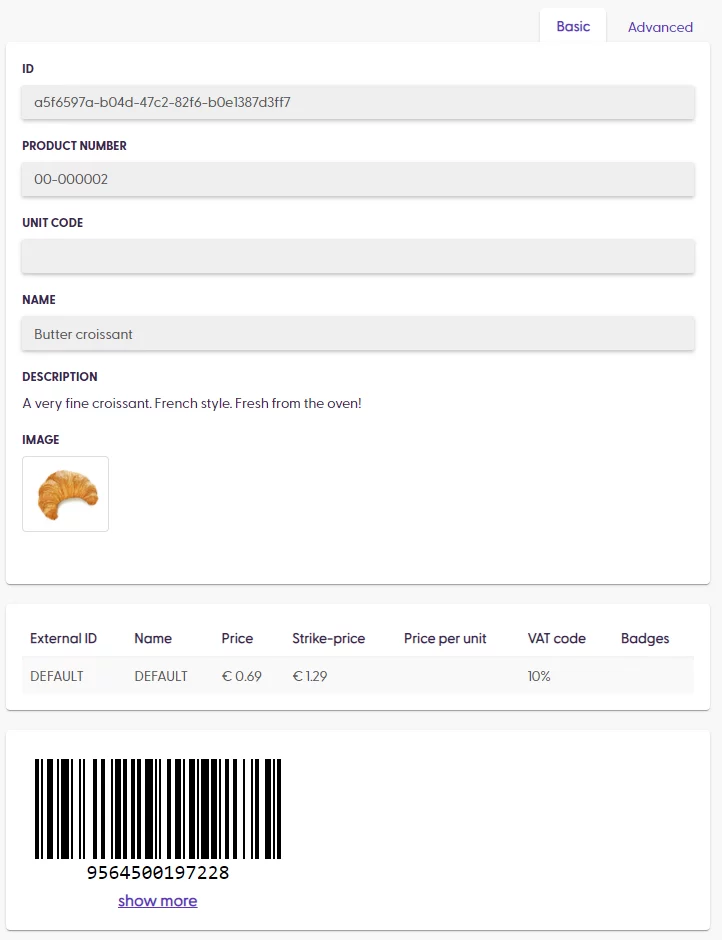 productNumberidentifies the specific product entry and be used to update the same product information in subsequent imports. It should also be recognizable by the cash register (if an external system is implemented). TheproductNumber, in combination with theunitCode, must be unique. This means that, for example, theproductNumbercan be imported twice only if theunitCodecan distinguish the two products from each other (e.g., theunitCodecould be “ST” for a Single item or “PK” for a Pack).