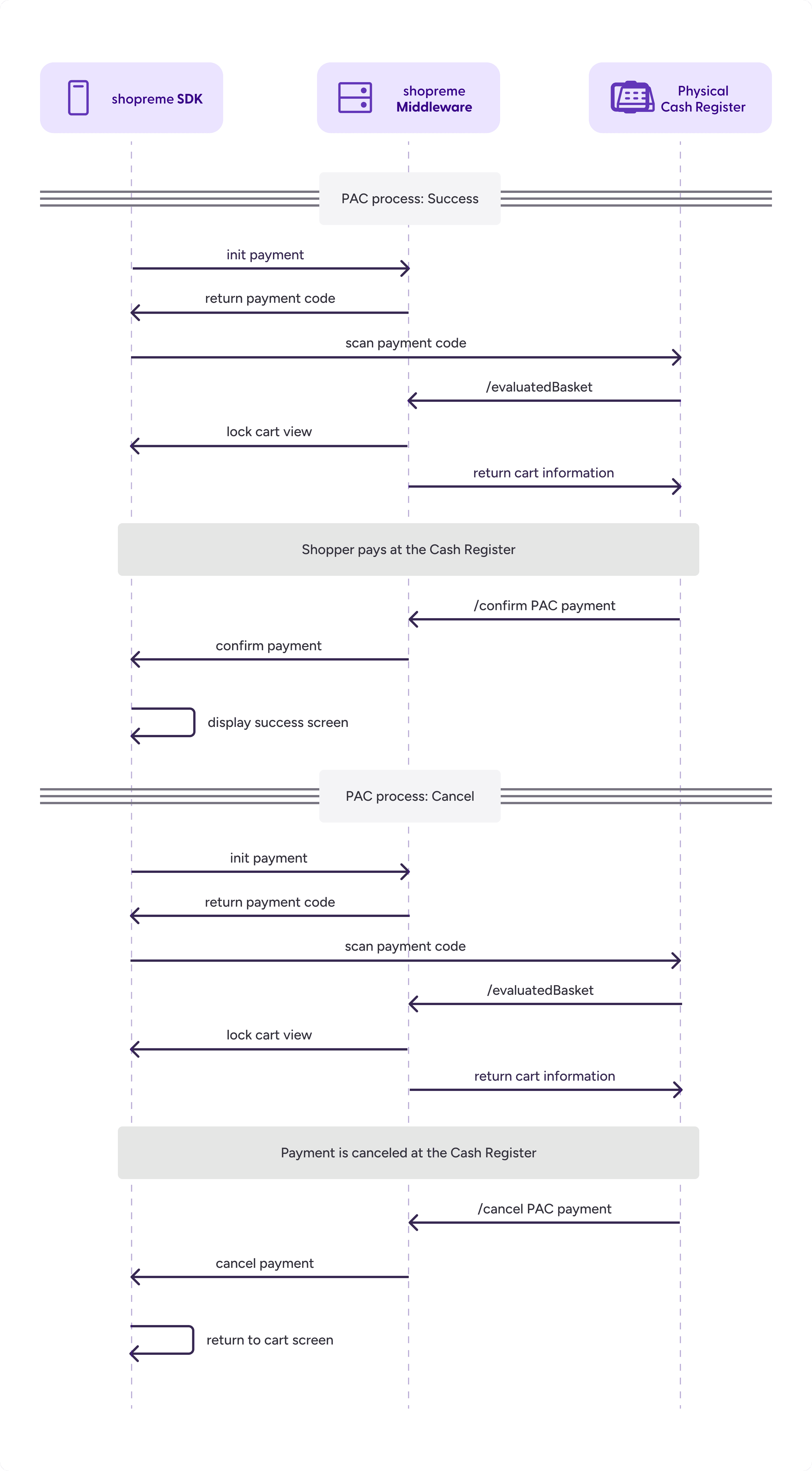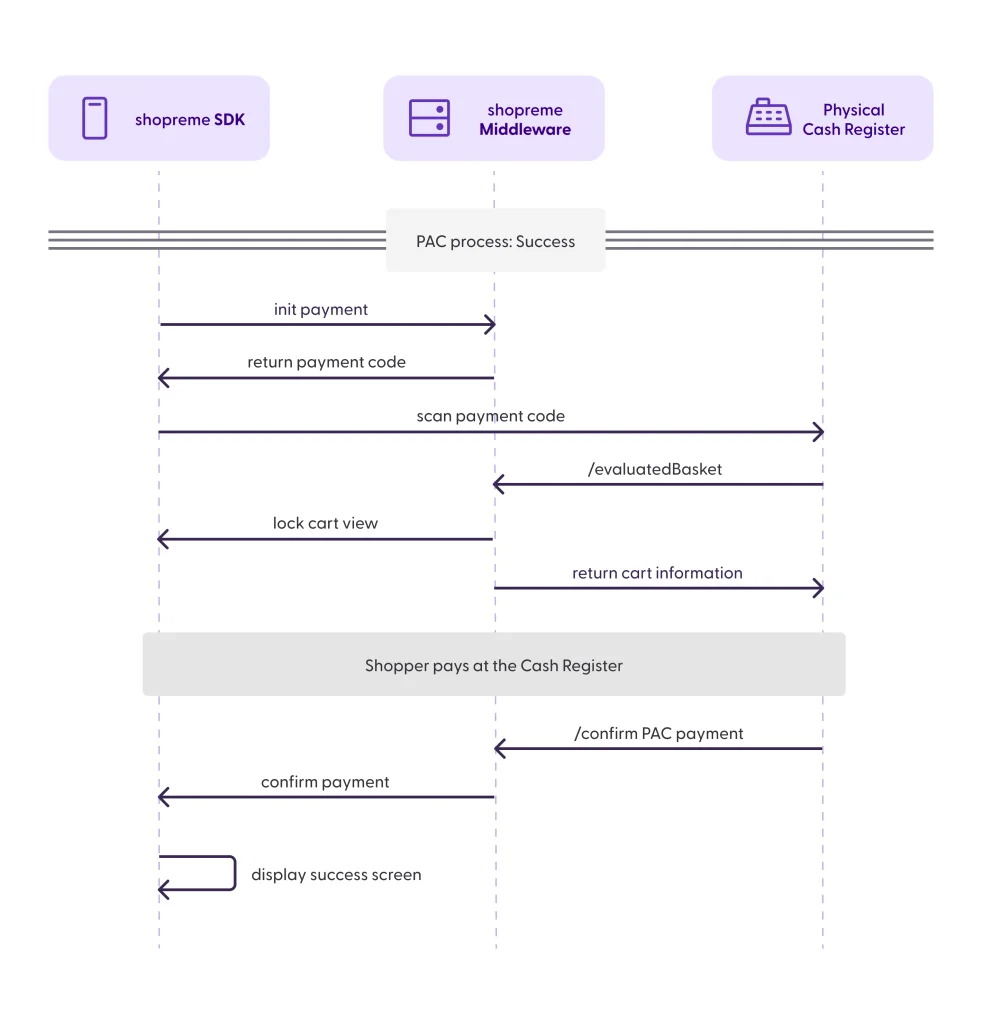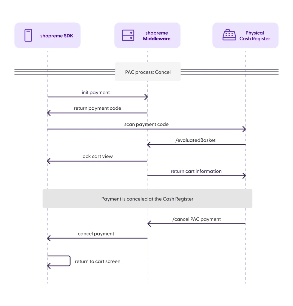 transactionid).Inform shopreme about the outcome of the payment process (confirmed payment or cancellation). Once the cash register loads a shopper basket, the Scan & Go app enters a lock state and awaits confirmation or cancellation via these endpoints.