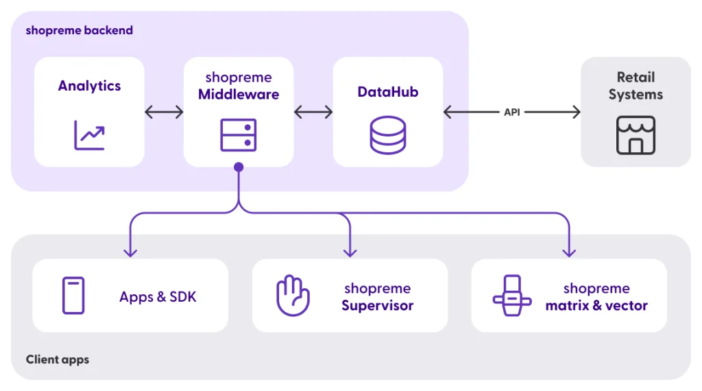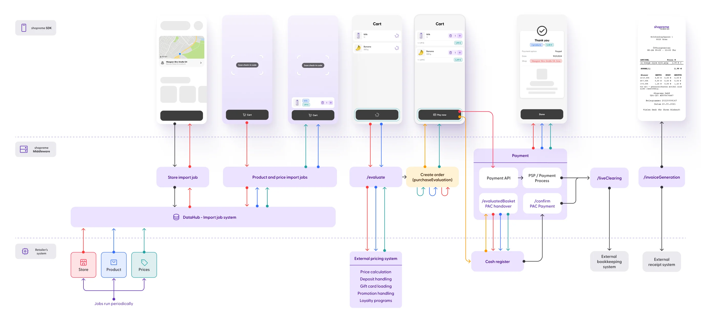 The following high-level diagram summarizes the data flow across the customer app, the shopreme Middleware, and other external (retailer) systems.