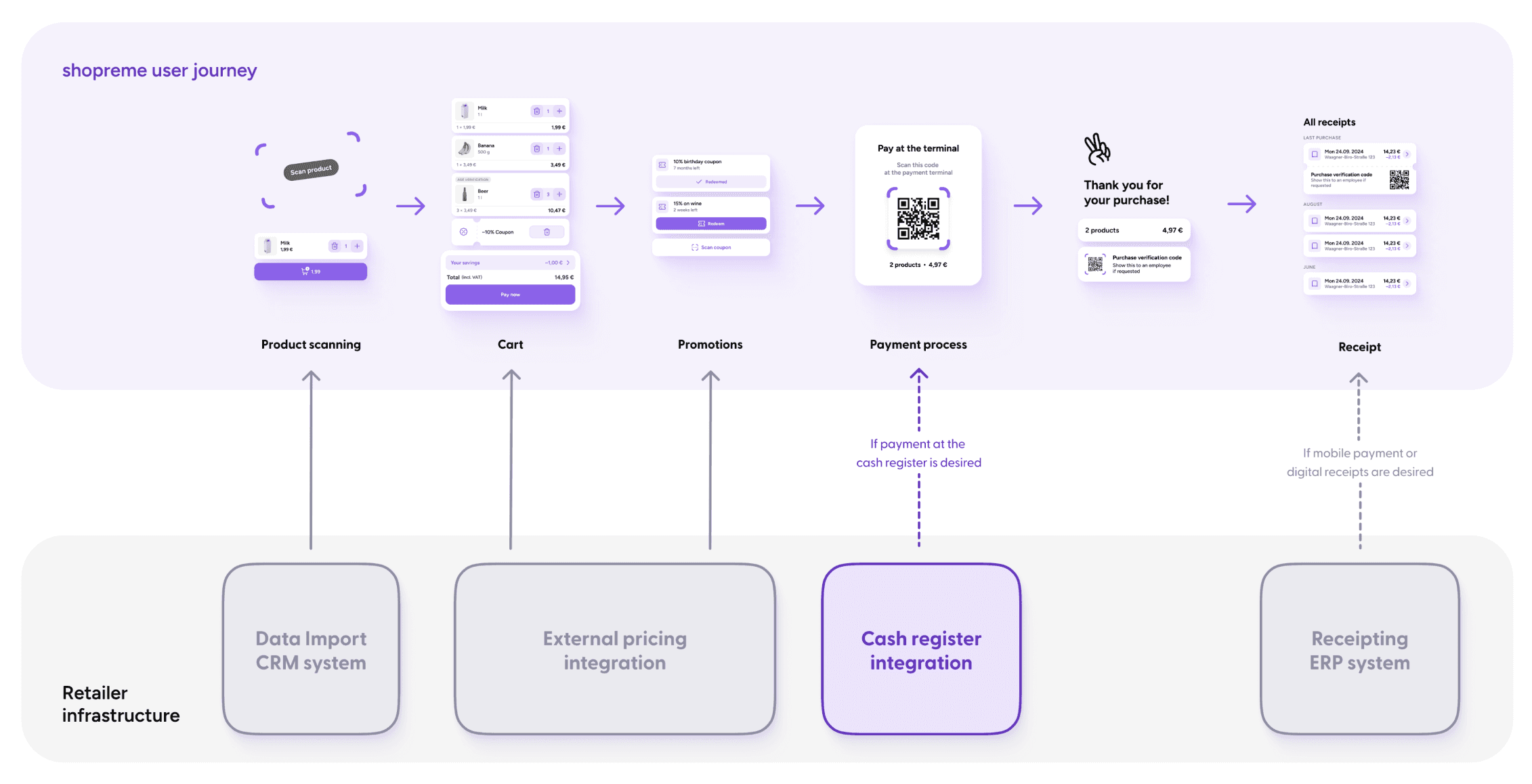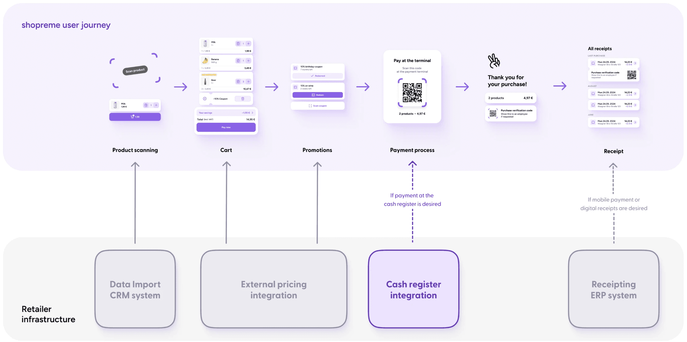 In many store setups, shoppers may be able to scan products themselves but then need to complete payment at a traditional staffed register (instead of using a digital payment on the app directly). shopreme enables this hybrid flow through the Pay at Cash Register (PAC) integration.